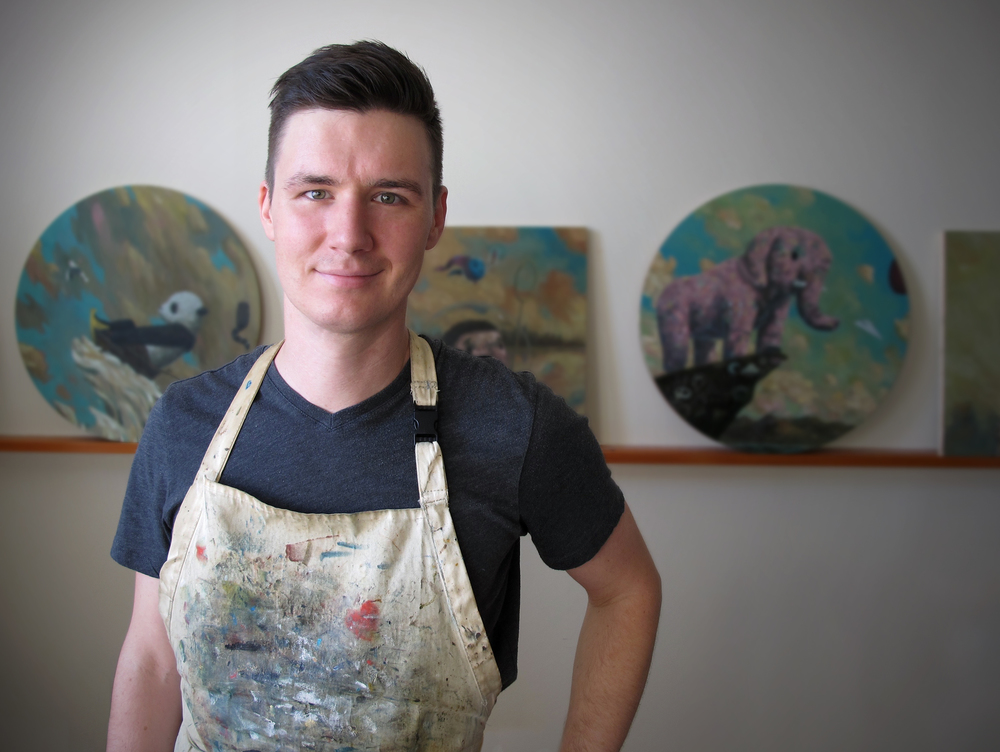 A native of Vermont, Durfee pursued a career in illustration after graduating from Savannah College of Art and Design in 2005, contributing to various publications across the Southeast, in addition to designing album art and commercial promotional materials. Durfee then began to explore his love of painting, creating fanciful contemporary narratives that feature an eclectic array of characters in mesmerizing and often contrasting color palettes. He made a seamless transition from illustrator to full-time painter in 2009. Each of Durfee’s paintings begins with an enormous amount of push and pull from the artist, in which ideas are refined and adjusted, until a rough idea starts to form. He then begins rendering the elements of the painting while maintaining a wandering state of mind. Many of his whimsical characters are faced with tough, yet universal decisions, conveying a sense of security in an unsure world to the viewer. He hopes to expand on these ideas and tell larger stories in his future work. Durfee continues to push himself to explore new techniques and color combinations, in addition to collaborating on works with other painters including Robert Lange, Megan Aline and Charles Williams. Collaboration not only lends to each artist’s strengths, but also creates a conversation between two styles that a lone artist would not be able to demonstrate. Durfee’s constant evolution as an artist has led to a body of work that is ever growing and continues to both thrill and fascinate its viewers.