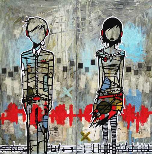 Aaron Kraten is a mixed media artist from Costa Mesa, California . Aaron Kraten was born March 15, 1974, in San Francisco, California. As a child, he moved to Huntington Beach in Southern California. As a teenager, Aaron was very interested in skateboarding and counter culture. After high school, he worked full-time jobs while establishing himself as an artist, taking jobs in factories and working a stint as a courier. He gained recognition in the early 2000s, and subsequently set up a studio in a Costa Mesa loft on the East side. Kraten grew up in Huntington Beach, California and spent many of his formative years drawing in 100-page sketchbooks, a practice he continues to this day. In 1999, while Kraten was working as a Vespa motorcycle mechanic, he experimented with painting on found objects. Kraten's first sales emerged after starting to display work in the thrift store, Stateside, at The Lab Anti-Mall where he was employed at the time, and sold a fair amount of it. Soon after, Kraten began submitting his work to galleries and museums in Southern California. Kraten's work has been shown in museums such as the Laguna Art Museum; Museum of Contemporary Art, Los Angeles; and galleries such as Gallery 23; Gallery C; Seven Degrees; and Subject Matter. Kraten shows about four times a year and posts new work on his website often. Kraten has filled over 58 100-page sketchbooks and created over 350 paintings. In 2019 Aaron Kraten's art was featured in the video game Fortnite by Epic Games. He currently paints full-time.