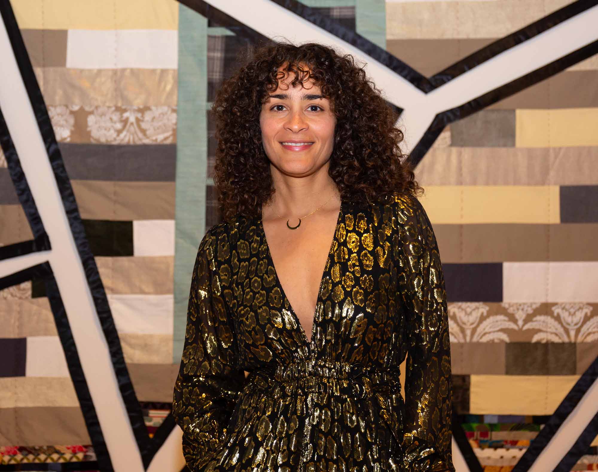 Weaving threads of African American experiences with broader ideas of identity, and collective history, my work investigates the fragile interconnectivity among all living things. Fragmented, constructed, and reassembled, I shed light on the multifaceted and complex parallels between the creative process and the nature of personal identity. My paintings feature abstracted, geometric shapes that imply movement – colorful forms expand and collapse freely among glittery backgrounds with hints of landscape and structural objects such as rooftops, windows and doors. While the textiles draw on the domestic and artistic traditions of quilt-making, they are pieced together, combining culturally diverse fabrics. While my work pays homage to the past through the use of repurposed fabrics and historical iconography, its bright atheistic imagery is informed by the future. The art reminds us of the importance of renewal and rebuilding, not only through the artistic process, but also through the possibility of transformative change.