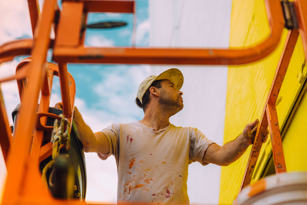 Alex Brewer, also known as HENSE, is an American contemporary artist, best known for his dynamic, vivid and colorful abstract paintings and monumental wall pieces. He utilizes unique color and composition in his installations to evoke a bold presence in the varied spaces they inhabit. Brewer, a native of Atlanta, Georgia began his career painting and writing on the walls around the city at a young age. He discovered his love for creating art in public spaces through graffiti in the 1990’s. He produces numerous public works worldwide through a combination of techniques learned through graffiti writing and the formal language of abstract painting.