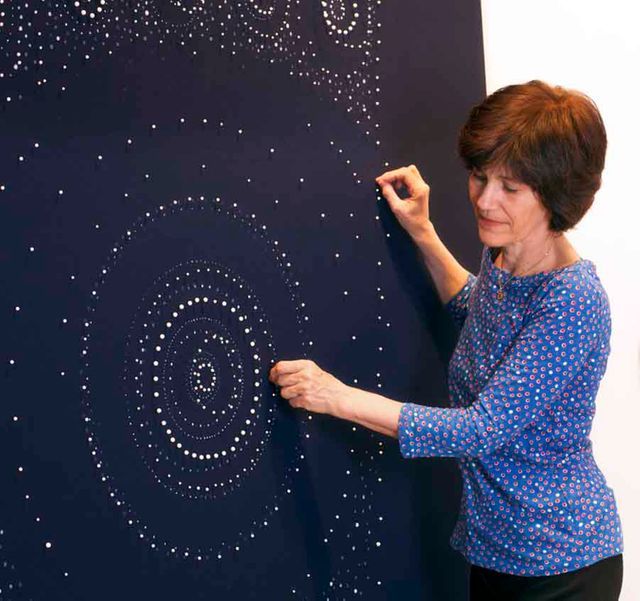Originally from Denver, Colorado, Andra Samelson currently lives and works in New York City. She holds a Bachelor of Arts degree from Sarah Lawrence College and is a recipient of fellowships from the New York Foundation for the Arts, the Corporation of Yaddo, and the Virginia Center for the Creative Arts. Samelson’s work has been exhibited extensively in galleries and museums throughout the United States and Europe and her public artwork, commissioned by New Jersey Transit, is permanently on view at the Hudson Bergen Light Rail’s Second Street Station in Hoboken, NJ. She has been a visiting artist at the University of Virginia, Stone Quarry Hill Art Park, and the ceramics factory Ditta Grazia Majoliche Artistiche in Deruta, Italy. Her work has been reproduced and reviewed in the New York Times, Art Forum, New York Arts, New American Painting and elsewhere, and is represented in several private and public collections including the Rubin Museum of Art, the Library of Congress, Chase Manhattan Bank, Dow Jones, and the Loyola University Museum of Art. A recurrent theme in Samelson’s work is the relationship of microcosm and macrocosm, the celestial and terrestrial. The imagery in her paintings is often associated with molecular and galactic systems. She often works with circular imagery, referencing both metaphysical concepts and circular forms in nature from the microcosm of the cell to the macrocosm of the starry universe.