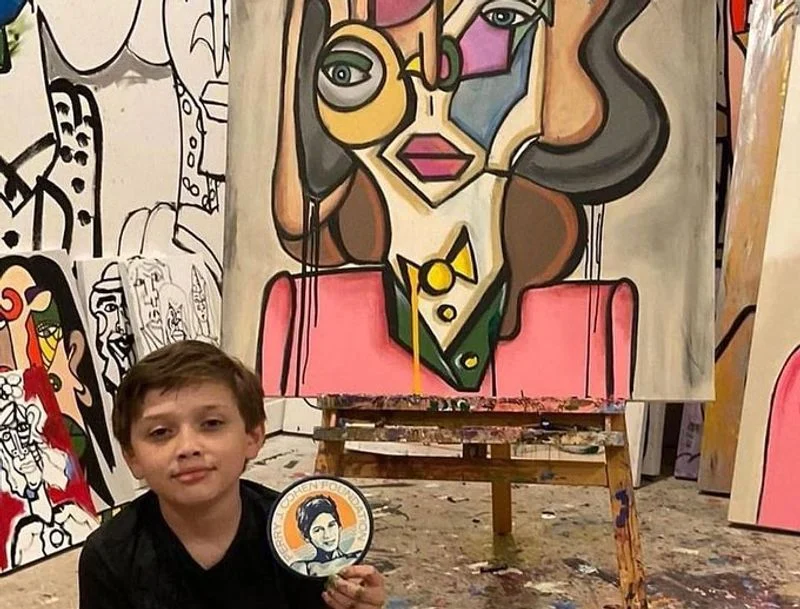 Andres Valencia (b. 2011) is a San Diego, California-based contemporary artist known for large, dramatic, colorful figurative paintings that are deeply influenced by George Condo, Picasso, and Cubism. Valencia has been painting since he was five years old, He stands on a step ladder to create large-scale works with a mix of oil stick, and oil and acrylic paint, seeking to create bold colors and wildly imaginative fragmented facial compositions. Teachers involved in his California public school Visual and Performing Arts (VAPA) program quickly identified his extraordinary talent. Surrounded by art at home, Valencia is inspired by RETNA, Richard Hambleton, Raphael Mazzucco, Salvador Dalí, and other artists his father began collecting about seven years ago.