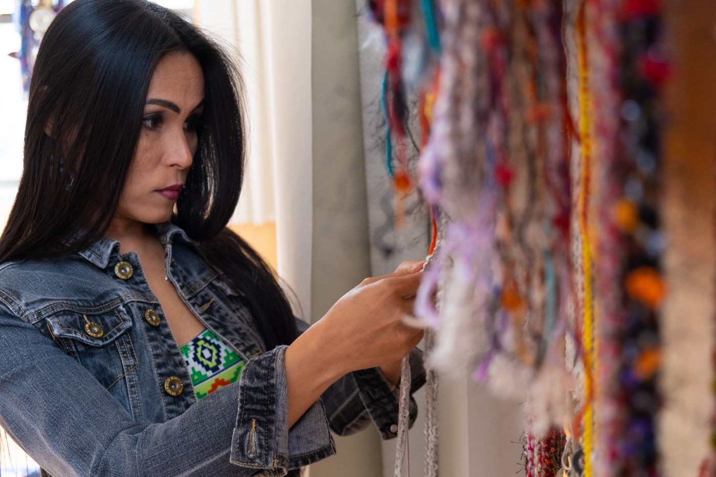 Held together by the South East Asian art of Pua Kumbu weaving, which Samat formally studied, these works juxtapose the hand-crafted feel of weaving with the hard aesthetics of industrial objects. She combines traditional craft, which she practices with pride, with inferior, mass-produced products. Her work is meant to thwart the stable gears of the calm tradition. Just as the search for self is a long and winding process for humanity, her monumental sculptures do not reveal their history and legacy immediately. Much of her work reflects upon her vital relationships, her immediate family, particularly her mother who recently passed. Each work is foundationally unique; they each have their own story embedded. They are about love, individuality, and liberation.