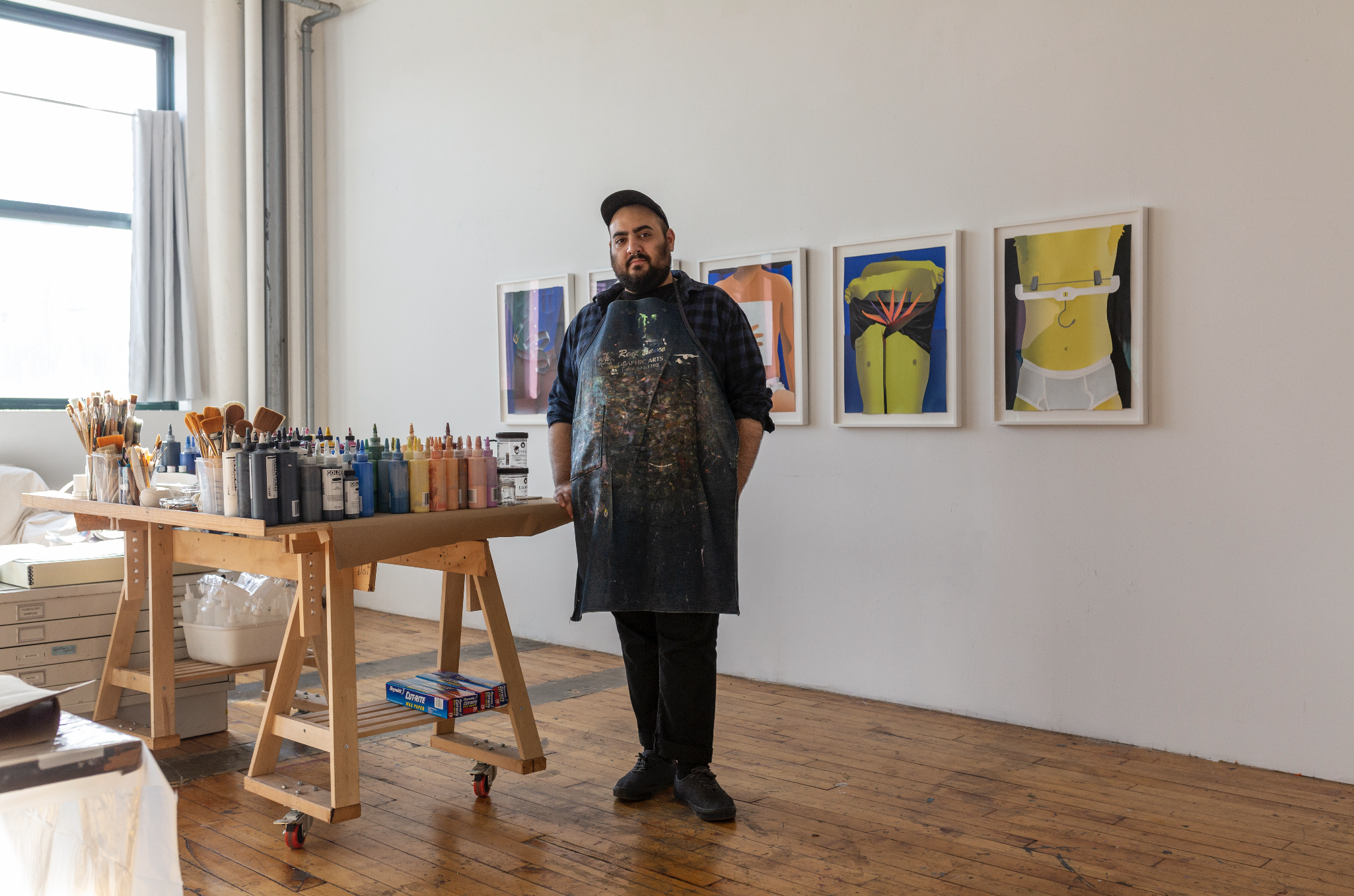 Anthony Iacono is based in New York (b. 1987). He received his BFA from the School of Visual Arts in New York and his MFA from Virginia Commonwealth University i n Richmond, Virginia. He attended the Skowhegan School of Painting and Sculpture i n 2013 and has been an artist in residence at LMCC Workspace and the Museum of Art and Design. He has had solo exhibitions at The Approach, P.P.O.W. Gallery, and Capsule Shanghai. His work has been included i n group shows at 106 Green, Jack Hanley Gallery, and Hesse Flatow and he’s been featured in New York Magazine, New American Paintings and The Village Voice. In 2017 he was a recipient of the Toby Devan Lewis Award. Iacono is currently a resident artist at the Sharpe-Walentas Studio Program. Iacono works primarily in collage from cut-out sections of painted papers. This process produces an unusual crispness made from the cut rather than the painted boundary between objects and bodies. The collages are easily mistranslated, first appearing as digital images or flat airbrush paintings, while in person they are flooded with paint and texture. Accompanying the collages are a new series of mixed media works made from watercolor and pastel rubbings. Each image is built from graphic textures producing topographical maps and puzzle piece-like outlines revealing what's underneath. Belts, combs, and watches — all alluring props found i n these 80’s thrillers — could act as evidence from a crime scene or remnants in a lost and found box of a cruising space. These rubbings prioritize touch over vision, leaving behind visual residue of tactile sensation.