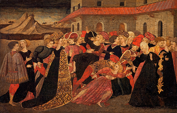 Apollonio di Giovanni was a very successful illuminator of manuscripts and painter of furnishings for Florentine palaces. He ran, in partnership with Marco del Buono Giamberti (1403-89), a prolific workshop which specialised in the production of chests (cassoni), special trays celebrating births (deschi da parto) and panels set into walls or attached to furniture. These were usually painted with scenes from ancient Greek and Roman mythology or history, but also included themes inspired by more recent literature, such as Petrarch's 'Triumphs' and events of personal significance for his patrons. His characters' costumes and settings tended to reflect contemporary fashions.