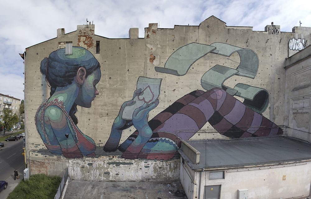 Aryz prefers to create large character murals- and by this he really means LARGE! This quickly earns him a spot with some of the best muralists. He states that placing a shape on a wall is a simple excuse to put colors in one place or another. Aryz also prefers to avoid focusing on a specific message.