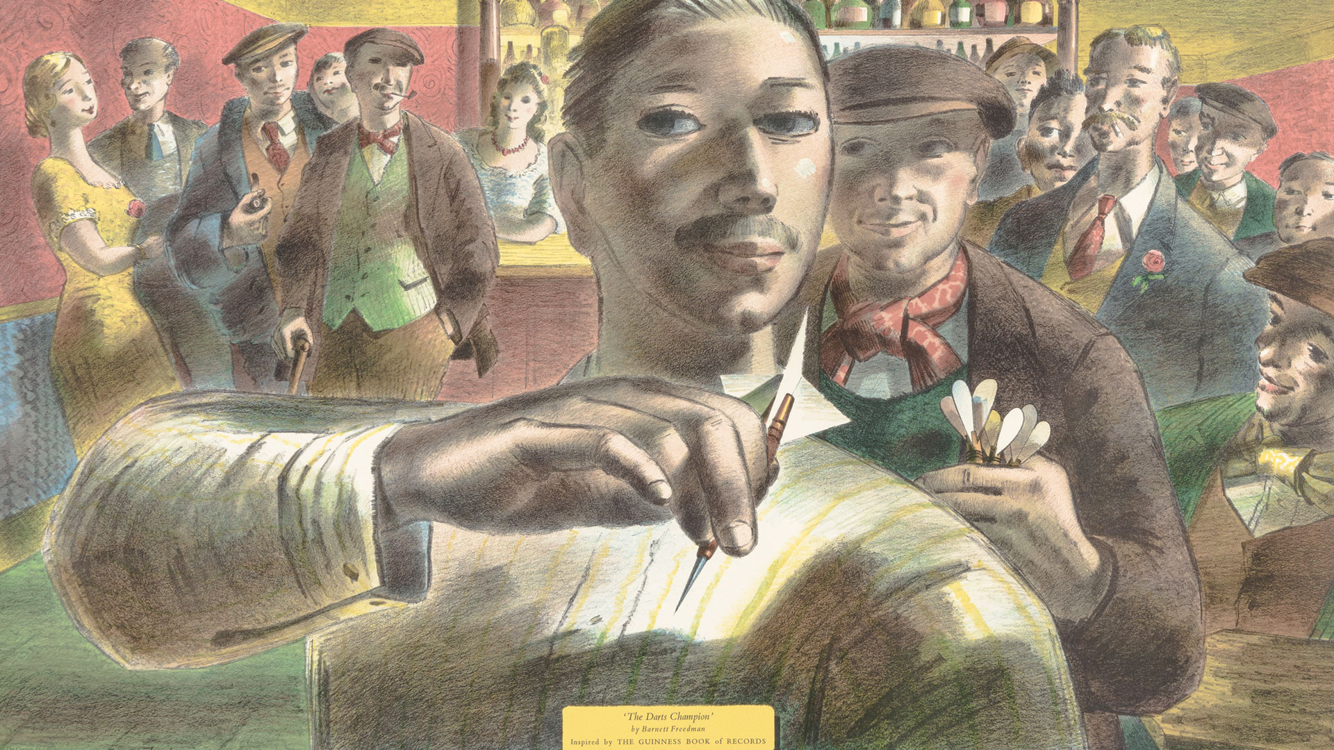 Among Freedman's later book designs were those for the 1952 print of The Palm Wine Drinkard by Amos Tutuola and the 1953 edition of The Devil Rides Outside by John Howard Griffin.The inimitable style of Freedman's book jackets drew the eye of the 'bookshop prowlers', as they were termed by Maurice Collis, an author who realised and admired the important role that Freedman's art played in bookshop sales. Freedman produced a stream of colourful posters and black-and-white drawings for press advertisements. At Chromoworks he had total oversight of the production of the Lyons lithographs, a series of fine colour prints by British artists, which were displayed in the teashops of J. Lyons and Co., now regarded as a major achievement in bringing good art to 'the masses'.Among his last works were a series of lithographs, including a poster The Darts Champion, to promote the first Guinness Book of World Records published.Unlike many of his contemporaries, who lived and worked into old age, Freedman's precarious health led to an early death, at work in his home studio on 4 January 1958. A major retrospective exhibition of his work, organised by the Arts Council, was held at the Tate later in 1958 but a second such exhibition was not held until 2020 when the Pallant House Gallery hosted Barnett Freedman: Designs for Modern Britain.