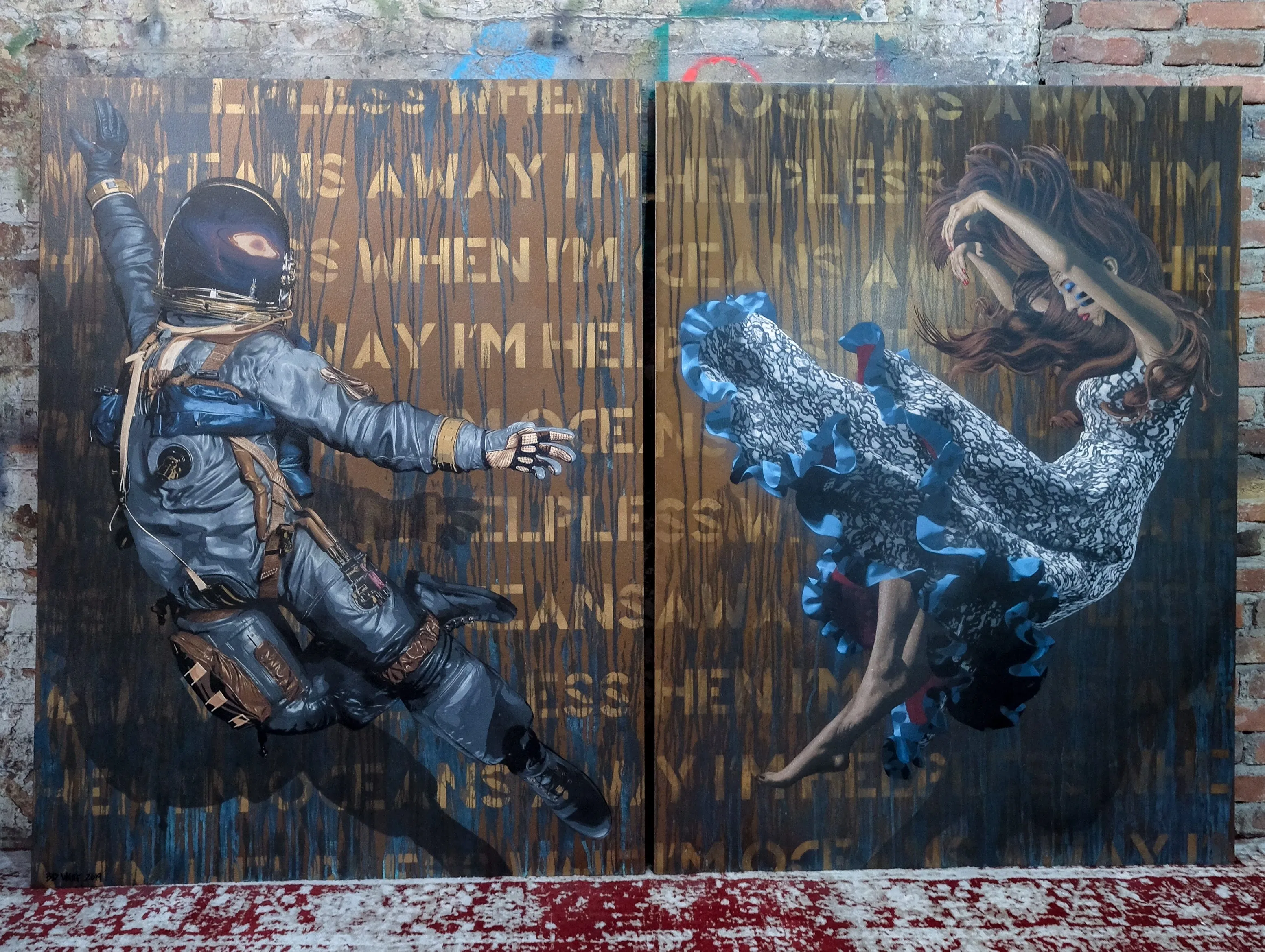 Inspired by Shepard Fairey's style, B.D. has taken the stencil technique to unprecedented levels of complexity; utilizing 60 to 95 stencil layers per painting. The works are visually stunning, however the concept and message are most interesting. B.D.’s recent works depicts an astronaut in multiple states of movement, sometimes alone, sometimes entwined in a tragic embrace with a female form. The astronaut represents man at his most lonely and distant self, though present in many of the paintings with the female love interest, the seemingly insurmountable obstacle of love lost, and longing is obvious.