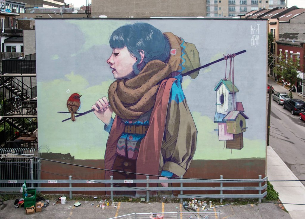 BEZT of Etam Cru is known primarily for large-scale murals painted with Sainer as part of the Etam Cru duo, BEZT’s work is resistant to the ascription of excessively assigned meaning, preferring to allow the imagery to speak for itself. BEZT juxtaposes saturated colors and loose brushstrokes with delicate, refined lines and patterns. His dream-like compositions often feature a central figure, silently contemplating the unknown, capturing the moment when someone is lost within their own thoughts. The scenes depicted quietly draw the viewer in, making them take pause and consider the unknown.