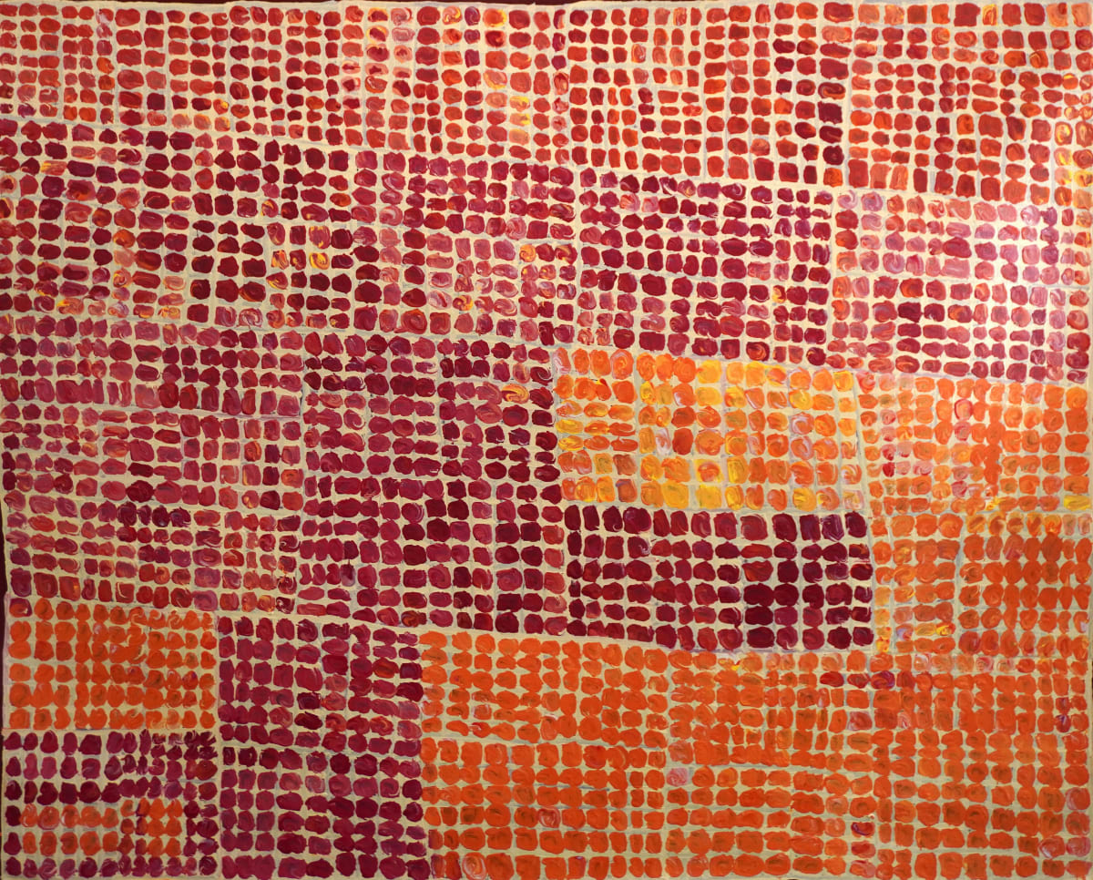 Carbiene McDonald was born in Papunya in 1961, son of Snowy McDonald and as a young man, he travelled back to his father's homelands and inherited his Tjukurrpa (Dreaming). This Dreaming is associated with a series of waterholes running between Docker River and Kata Tjuta. Specifically, it includes four important sites: Petermann Ranges, Docker River, Kalaya Murrpu (Blood's Range) and Mulyayti near Kata Tjuta. Carbiene’s work embodies quality of innovation within tradition, and his practice of filling the canvas with coloured squares of loose acrylic paint creates work of immense depth and sophistication. Having only taken up painting later in life in 2018, his passion for painting coupled with his extreme dedication and enthusiasm has led him to quickly make a name for himself. Winner of the prestigious Hadley’s Art Prize (2019), finalist in the Vincent Lingiari Art Award (2019) his work is held in Art Gallery of NSW Collection, Charles Darwin University Collection and in private collections in Australia.