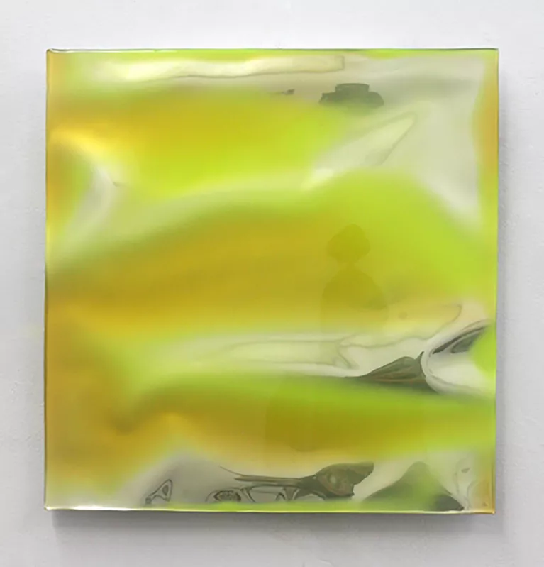 In her recent Mylar series, color illuminated by reflection, along with mylar’s unpredictability of forms, provides many avenues to explore her interest in luminous color, resulting in the fusion and blurring of lines between a painting and object. She pours thin veils of pigmented resin, floating one atop another. Often it is necessary to sand in between layers.