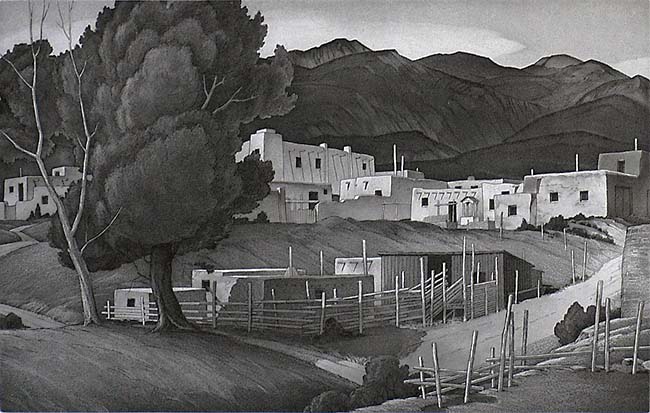 A printmaker especially known for subtle tonal variations in aquatints, Charles Capps, whose friends called him "Chili", did many images of Midwestern scenes and Southwestern subjects as well as commercial art endeavors. He was especially taken with the adobe architecture of Taos and Santa Fe. He created his own plates, and turning out editions of about 100, signed and numbered each one in pencil. In total, he completed about 80 prints, of which half are aquatints, a third etchings and drypoints and the others blockprints and lithographs.