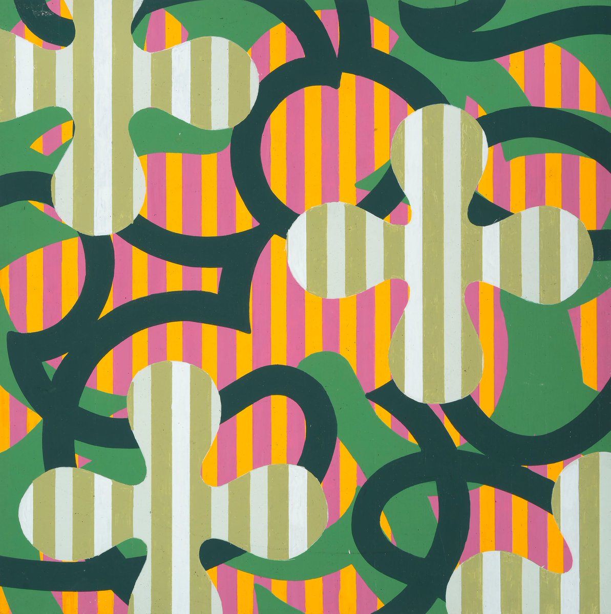 The work I’ve been doing since the early 1990’s involves a specific layering process. They mostly rely on the interaction of the controlled dripped line, maze like linear forms, and organic and geometric forms. The paintings are constructed one layer of forms at a time, starting with layers of drips that have a specific color structure. The forms I use are part of a constantly evolving vocabulary of shapes that began with organic forms I started developing in the early to mid 1980’s. At that time I was interested in pre-history, and used forms derived from biology, archeology and natural history. When developing images I still sometimes refer to the biological diagrams and photos I’ve collected over the years. Now however, they have become simplified, are less illustrative and are more general or ambiguous. The forms have their own developmental process involving genealogy and hybridization. A shape may have a familiar quality, but it remains uncertain whether its origins are organic, or derived from an industrial product. The development and evolution of the paintings are integrally connected to the evolving nature of the forms. I’ve developed hundreds of templates of varying sizes, for solid shapes as well as for liner forms. Symmetry, asymmetry, anthropomorphic, geometric, biomorphic are some of the categories of forms I use.