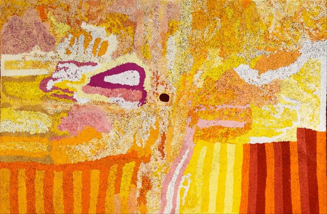 Christine is the youngest daughter of leading Balgo artist Helicopter Tjungurrayi and the late Lucy Yukenbarri, both exceptional painters in their own right. She learned to paint by sitting with her mother, watching and learning from a very young age, eventually assisting her mother and then painting her own artworks through Warlayirti Artists at the young age of 19. Christine has been painting since late 1999 and has produced detailed and innovative works in the mediums of acrylic paint on canvas and kiln fired glass. Christine paints Winpurpurla, her mother’s country south of Balgo in the Great Sandy Desert. Women often travel to Winpurpurla to collect a variety of seeds including lukarrari which is ground to make damper and kumpupatja (bush tomato). Christine’s Winpurpurla paintings are named after the tjurnnu (soakwater) or ‘living water’ she depicts as the central circle in her paintings bordered by multiple lines representing the tali (sandhills) that dominate the country there. By 2004 Christine had well-and-truly established her distinct style and worked prolifically and on a large scale until 2011 when she left Balgo and Warlayirti Artists and moved to Broome. She recently returned to Balgo in 2017 with the desire to start painting again. Today everyone in Balgo is thrilled to see her back involved with the art centre and painting again. Christine has been twice nominated for the National Aboriginal and Torres Strait Islander Art Awards (NATSIAA) and in 2011 she had a solo exhibition with Alcaston Gallery. Her art features amongst significant collections across the nation.