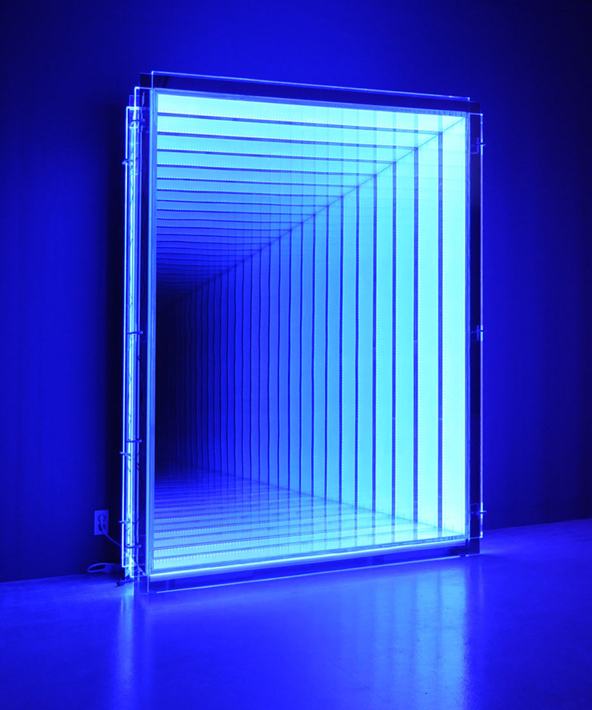 Shaped within finite dimensions, the works of Chul-Hyun Ahn employ a combination of lights and mirrors in order to manipulate perspective. The repetitions of light patterns, resulting in boundless reflections, convey the impression of looking into seemingly limitless space. By providing an illusionistic environment, Ahn’s sculptures encourage the viewer to consider concepts that defy human understanding. “ By looking at the emptiness, I hope people can find the place or something they had been searching for”. Despite the use of basic industrial materials such as concrete, cast, plywood, mirrors neon and led lights Ahn has the ability to introduce a contemplative dimension to his works. Interacting with Ahn’s installations implies questioning the perception of the object and its construction: by looking deeply into his artificial environment, the obvious physical boundaries of the sculpture become doubtful, the illusion of the endless void and infinite depth generates a dazing paradox. Ahn’s knowledge in art and technology embraces the Zen practice of meditation: in the Zen Buddhist tradition, enlightenment is achieved through meditation, which can be increased by reducing optical stimuli. The dizzying visual impact provoked by Ahn’s balanced use of lighting and mirrors is aimed at tracing a pathway to a spiritual experience.