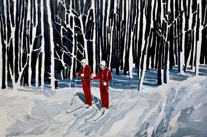 The images in Adolphs’ work in contrast are based on collected photographic images of ski resorts, family holidays and summer pools. They represent a past that seems a little more innocent and more elegant of simple pleasures. It seems a lost time.