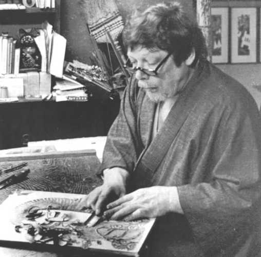Clifton Karhu first went to Japan with the US Army after WW II. He then studied at the Minnesota Art School from 1950-1952 before returning to Japan as a missionary in 1952. Several years later he began doing artwork again -- both paintings and watercolors. In 1963 he moved to Kyoto from Gifu and began learning the cutting and printing techniques of traditional Ukiyo-e style woodblock printmaking. By then he had mastered the language, the social mores and became committed to remaining in Japan. Some say he became more Japanese than the native-born, wearing traditional attire as he walked the neighborhoods of Kyoto and his second home in Kanazawa. He was the first foreign member of the Japan Print Association, and even became President of the Kyoto chapter. Karhu is famous for using a rich blend of colors, usually with a strong overprinting of black line – unlike earlier Japanese print styles. Subjects are mostly locations in and around Kyoto, and in particular traditional architecture. These buildings provide linearity and stability to the art, some of which may employ quite bright and strong color. Special effects and moods are created with the use of light and shadow filtering across scenes. He often used multiple shades of the same color to give subtle variation in design. Although people are typically absent in Karhu’s work, there is always a feeling of human presence behind closed doors.