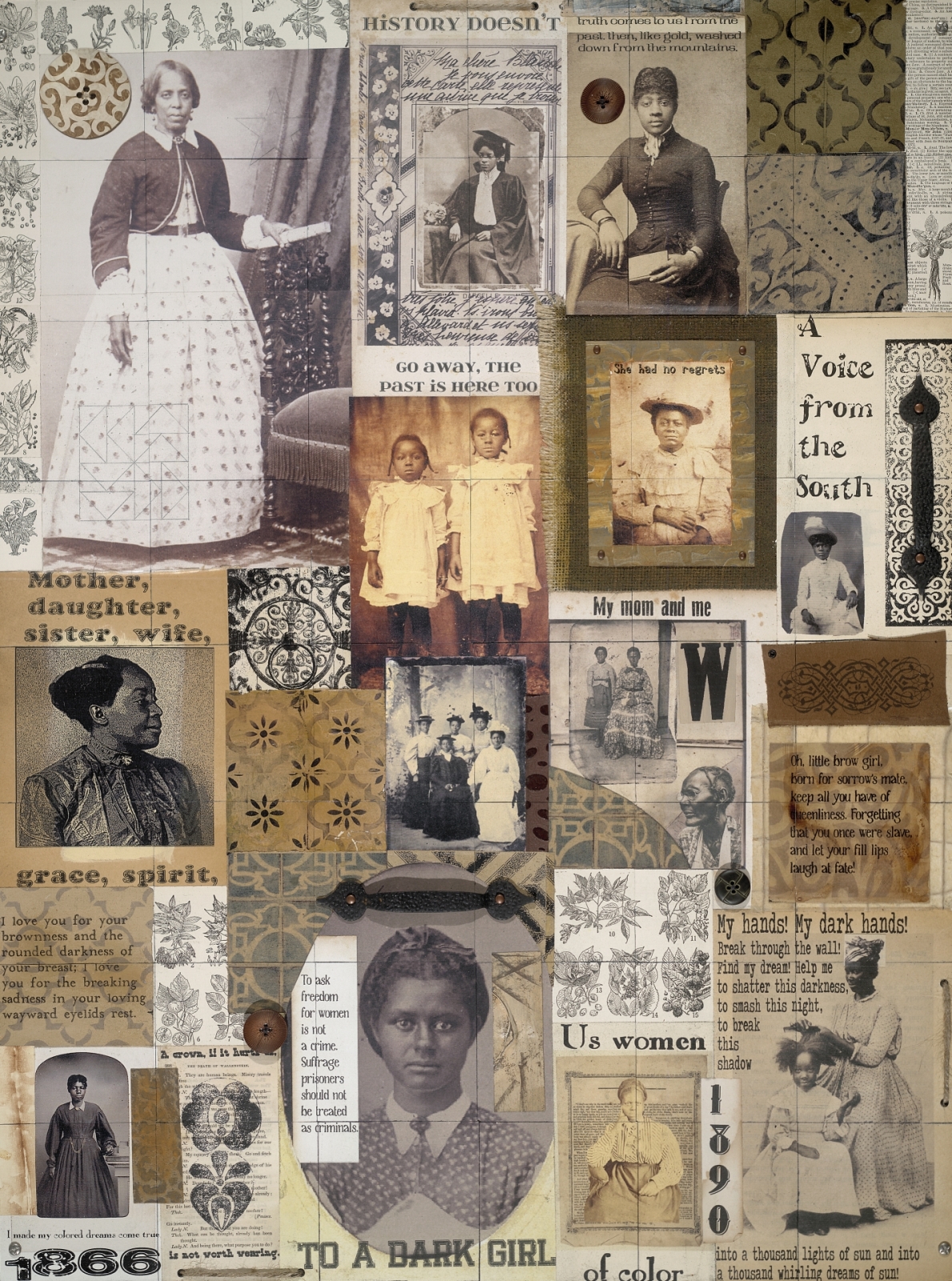 The beauty of mixed media art is the flexibility it offers to start with things around you and expand from there. As a mixed media painter, I juxtapose these visual elements into a language of moods and reactions that allow for the viewer’s own interpretations. The paintings starts with hand cut museum board blocks that are painted, embellished, scratched and merged together to form what I term “mixed media quilt paintings”. My goal is not to pre-plan the end results, rather to let the feelings and emotions of the overall design dictate how each block fit together. I allow the colors, patterns and textures to direct the composition. Mediums may include acrylics, pastel, graphite, texture crackle, watercolor or clay paint. I incorporate beads, rope, paper, grommets, fabric, hot glue and various other objects while constructing the blocks. Some replicas of vintage newspaper advertisements, articles, messages and photographs occasionally accentuate the compositions while adding a symbolic richness to the paintings. The meaning of the attached elements often becomes clearer to me as they are assembled. The result is a continual search for balance between spontaneity and historical relevance. Because of the multi-layering it is my expectation that the creation becomes a thoughtful, spiritual, interesting, sensitive and ongoing experience for the viewer.