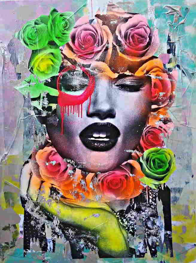 Dain, born and raised in Brooklyn, has become one of the most influential street artists to emerge from New York. Combining black and white photos of old Hollywood glamour and the bright, intense colors of graffiti, he creates paintings that are striking and unique. Often working on the street and in the studio, Dain combines silkscreening, acrylic, collage, wheat-pasting and spray paint. Crossing genres, he begins with portraits of classic Hollywood glamour stars of the 1940s and 50s that he collages on to neon-bright spray painted backgrounds. He continues to add advertisements, logos and other images along with acrylic and spray paint as he works the painting. His final and most distinguishing mark is the “circle and drip” of red around a single eye of the main subject. Dain views his work as a confrontation between the destructive gestures of graffiti and the femininity of his Hollywood subjects.