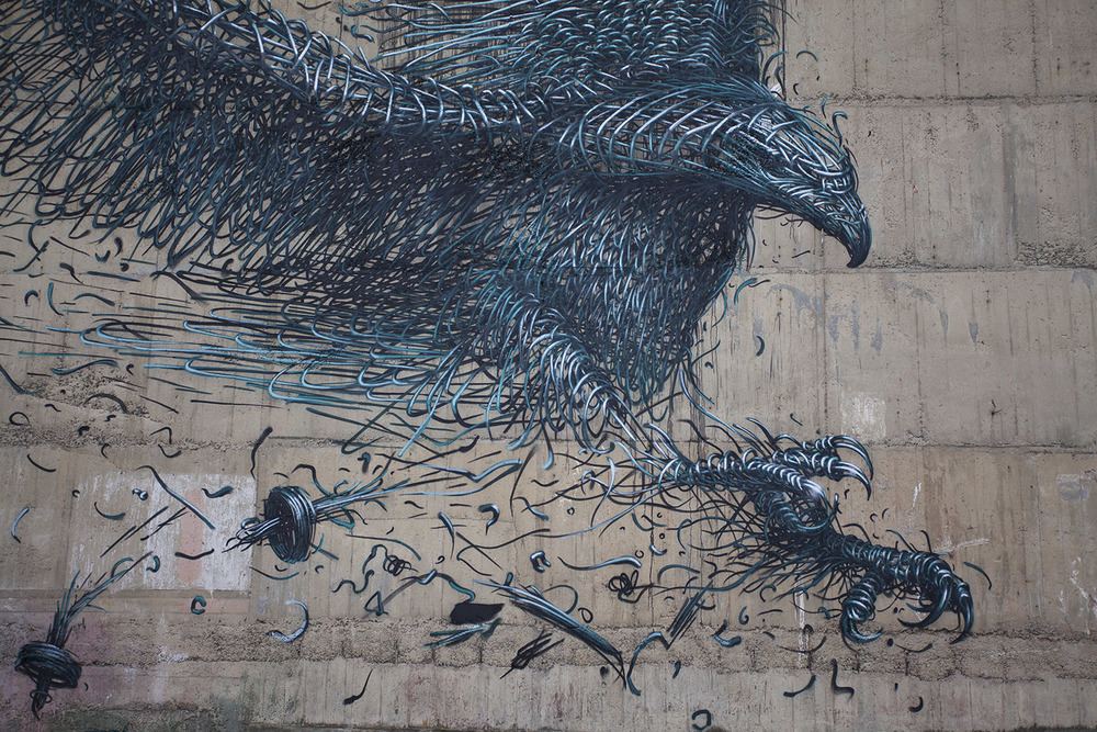 A majority of DALeast’s art utilizes animals as the subject matter. In many of his works, less pronounced line work in the background serves as a shadowing effect for the images illustrated in the forefront. The overall artistic effect of utilizing a dark base while simultaneously highlighting in fragmented, brighter lines is to make the images appear to leap off the wall or canvas; It is the artist’s skillful layering of lines that leads the viewer to be able to visually interpret the image in many different ways.