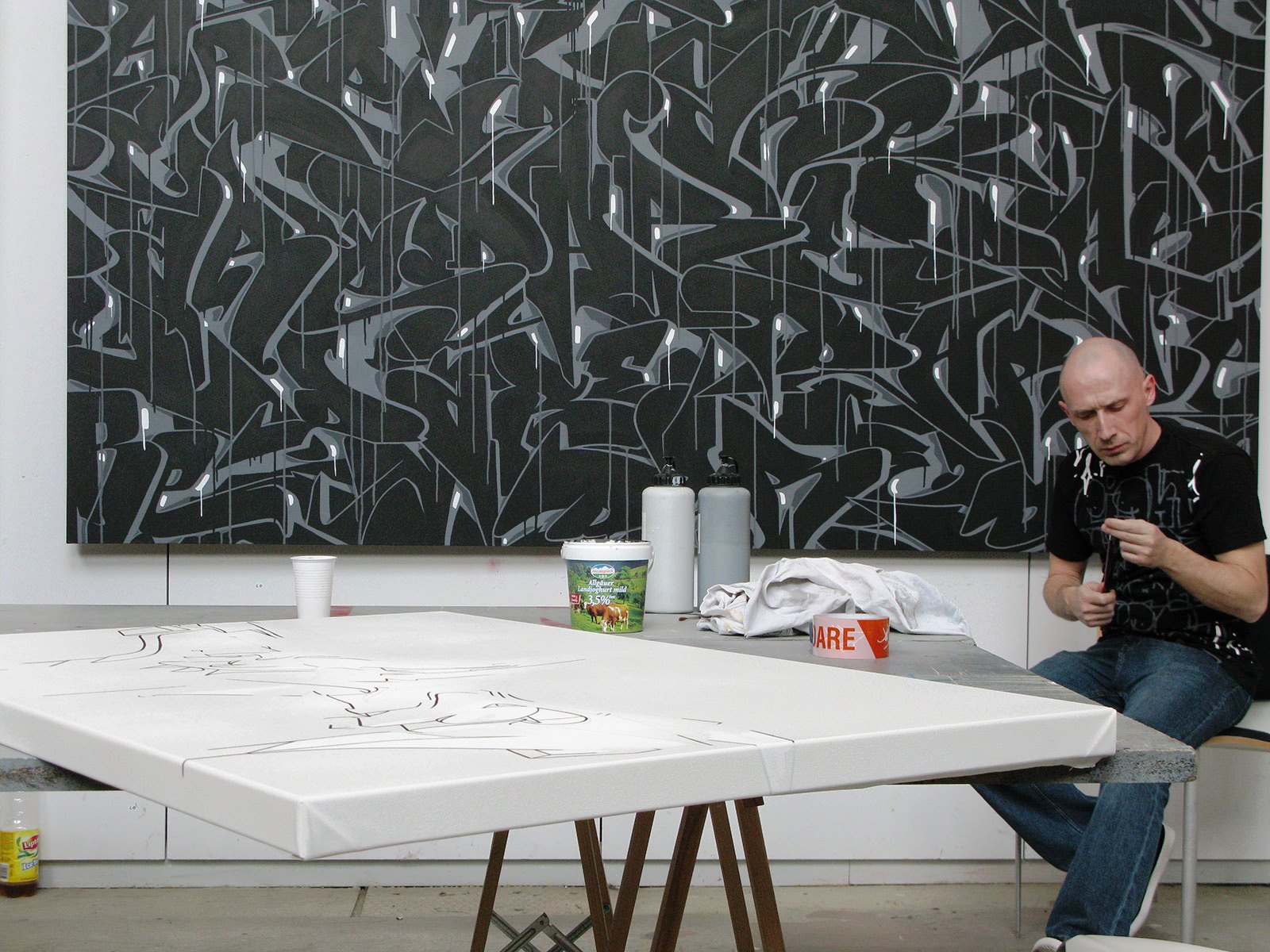After his first contract for the photographer Onorio Mansutti and a large wall installation for the district of Münchenstein (1990) there followed works such as a stage design for the Bejart Ballet in Lausanne (1992) and painting the theatre tram for Migros-North-West Switzerland (1995), with his first international press reports accompanied by television appearances and reports on Swiss television. This was followed by a comissions for the design of facades, walls, and shops in Los Angeles, New York City, and Hamburg, and life-paintings with other artists in Paris, Barcelona, Zagreb and Naestved (DK). At the graffiti exhibition "Concrete or Wallpapers" 2001 in the Swiss embassy in London, Dare met Banksy, who invited him to the exhibition "Urban Discipline" in Hamburg.