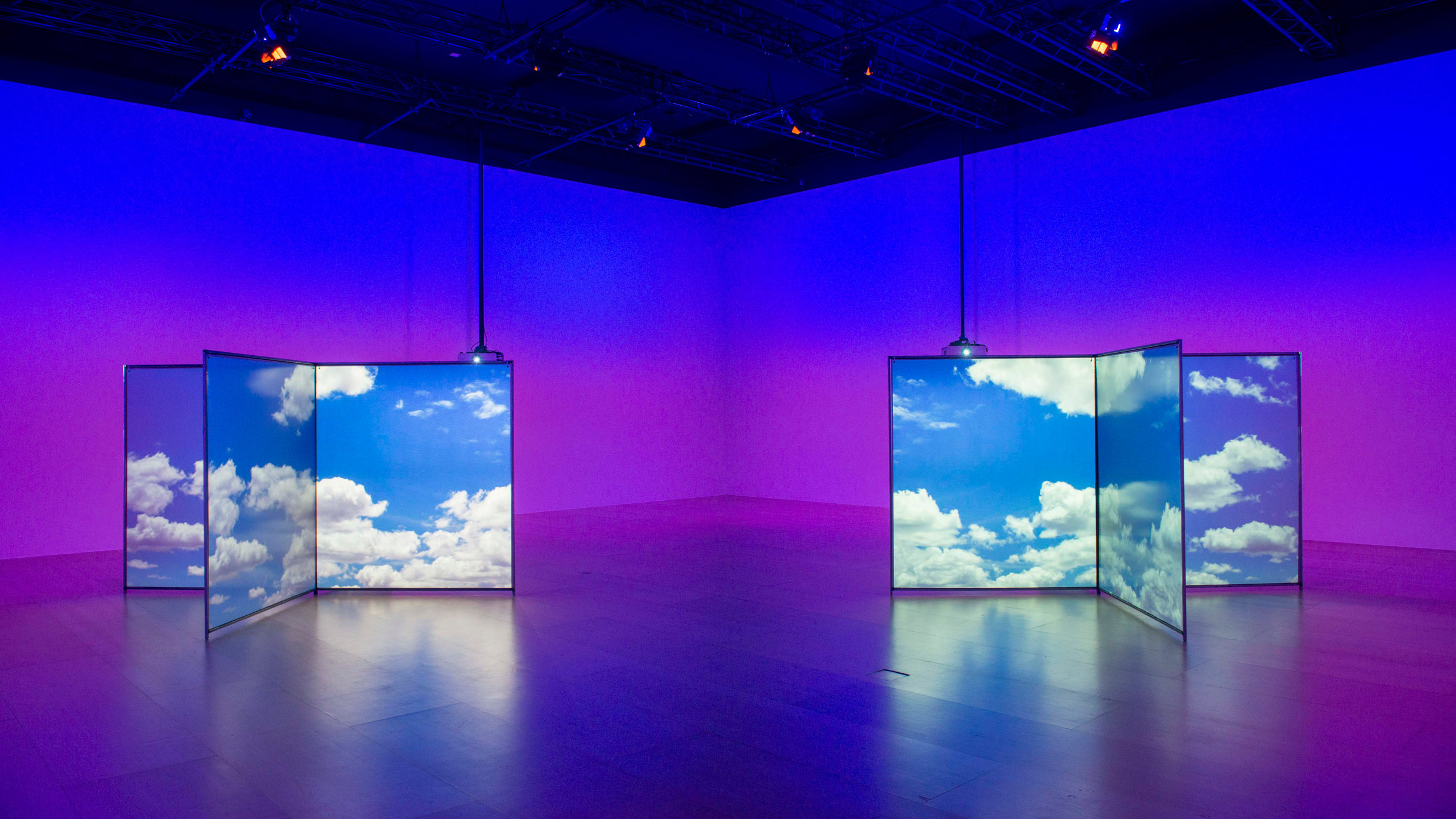 Thater also provides a window onto animal subjectivity through her use of atypical camera angles, dramatic shifts in scale, and colored lights that alter the spectrum of her exhibitions. Adopting cyclical time signatures and extended durations, Thater’s ambient works are abstractions of time which diverge from the linear narratives humans use to make sense of themselves and the cosmos. Whether using floor-to-ceiling video projections, stacks of television monitors, or screens placed flat on the ground, Thater’s installations are site-dependent and subtly change from venue to venue.