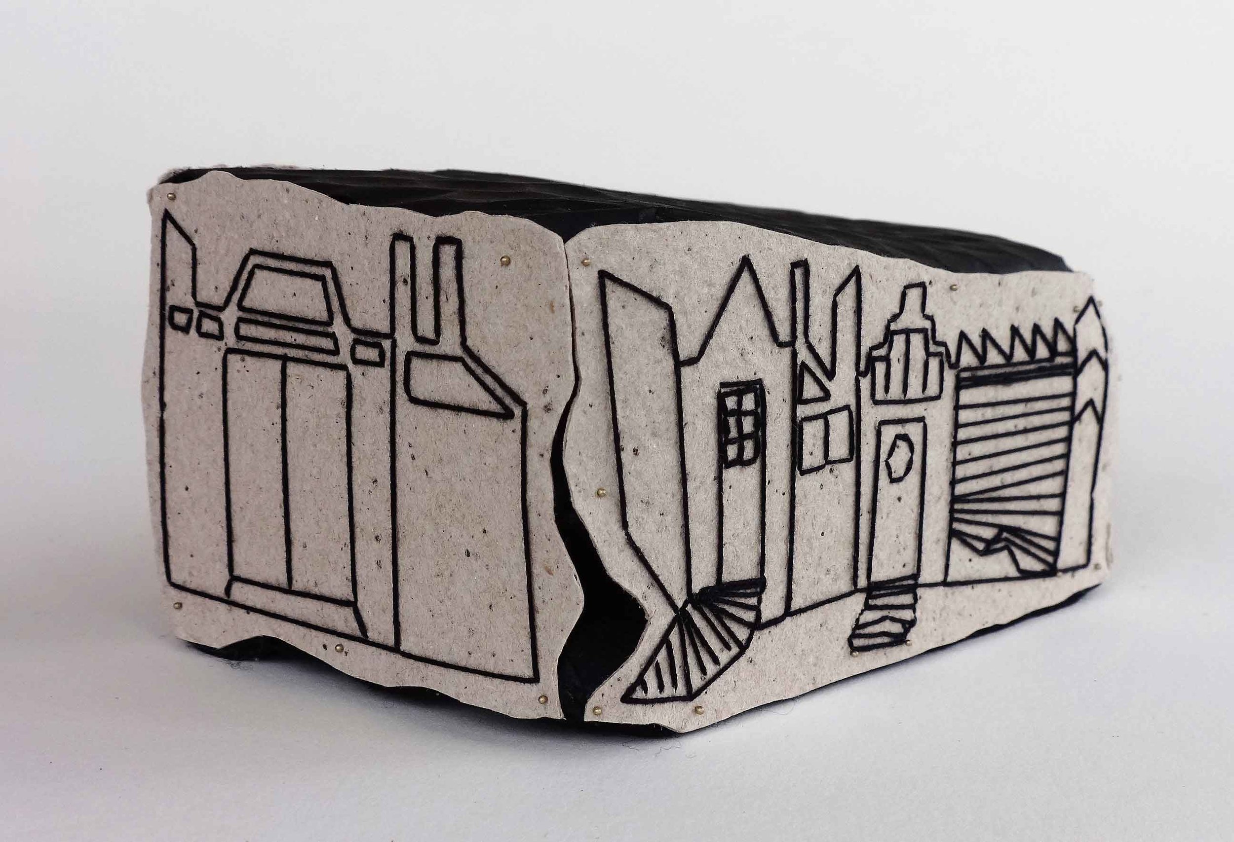 Dolores S. Slowinski, a long-time resident of Detroit, has a BFA in weaving and ceramics from Wayne State University. Her work experience includes art writing for national, regional, and local print and electronic magazines as well as serving as arts administrator and resource person at the state and local level for over 40 years. Slowinski returned to studio practice in 1999 and began showing her work in local, state, and regional galleries in 2005. She is among the first 100 World of Threads Festival Artist Interviews posted online at worldofthreadsfestival.com. Most recently her work has been included in three international exhibitions: 23rd International Open, Woman Made Gallery, Chicago, IL, 2020; Shifting Landscapes, Surface Design Association, juried, members exhibition at form & concept gallery in Santa Fe, NM, 2017; and World of Threads Festival 2016 in Oakville/Mississauga, Ontario, Canada. Her work has also been published in national and international magazine, books, and zines. Her art work explores the use of thread as line in the form of hand-stitched drawings on paper. Recently she has begun applying these drawings to re-cycled, industrial grade corrugate to create architectural statements about neighborhoods, urban decay, and gentrification. During the COVID-19 pandemic she created a body of 80 miniature, stitched, friezes: Marking Time Series, that she sent to numerous friends and colleagues to subvert the tactile contact usually discouraged when viewing art but so necessary in human experience, especially during pandemic lockdowns.