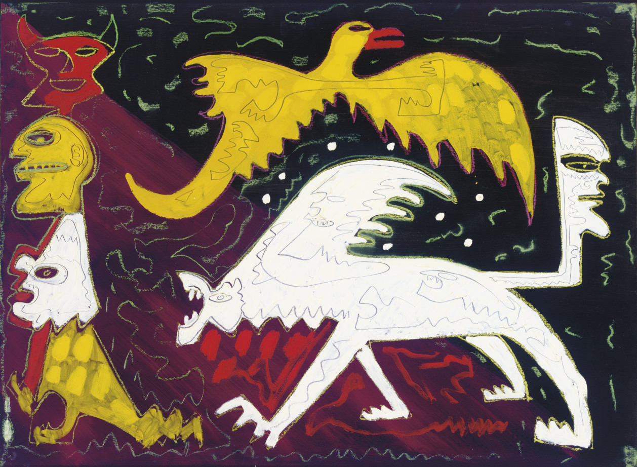 Emilio Cruz (1938-2004) was born in New York City where he lived for most of his life. An African-American born of Cuban descent, his continued deliberation on the mythic dimensions of human experience and expression carried through his multiple identities and activities as visual artist, poet, playwright and musician. For many years this veteran artist worked on paintings that involved large themes alluding to archetypes from a transcultural web of belief systems and traditions. Cruz was convinced that in order to produce any art of significance, one must have a clear commitment to humanity and its universal moral imperatives. He said “…integrity is formulated by acknowledging those things that we find inform us about the nature of the human spirit. The word inspired means ‘in the spirit’. (Being) in the spirit is always avant garde. For this reason Palaeolithic art always seems new, because it defines the moment of inspiration, through certainty of truth.” Cruz exhibited nationally and internationally and is represented in numerous museum collections, including the Museum of Modern Art, the Brooklyn Museum, The Studio Museum in Harlem, New York; the National Museum of American Art and the Hirshhorn Museum of Art, Washington D.C.; the Albright Knox Museum, Buffalo, New York; and the Wadsworth Antheneum, Hartford, Connecticut. The artist received many honors, including a John Jay Whitney Fellowship and awards from the National Endowment for the Arts and the Joan Mitchell Foundation.