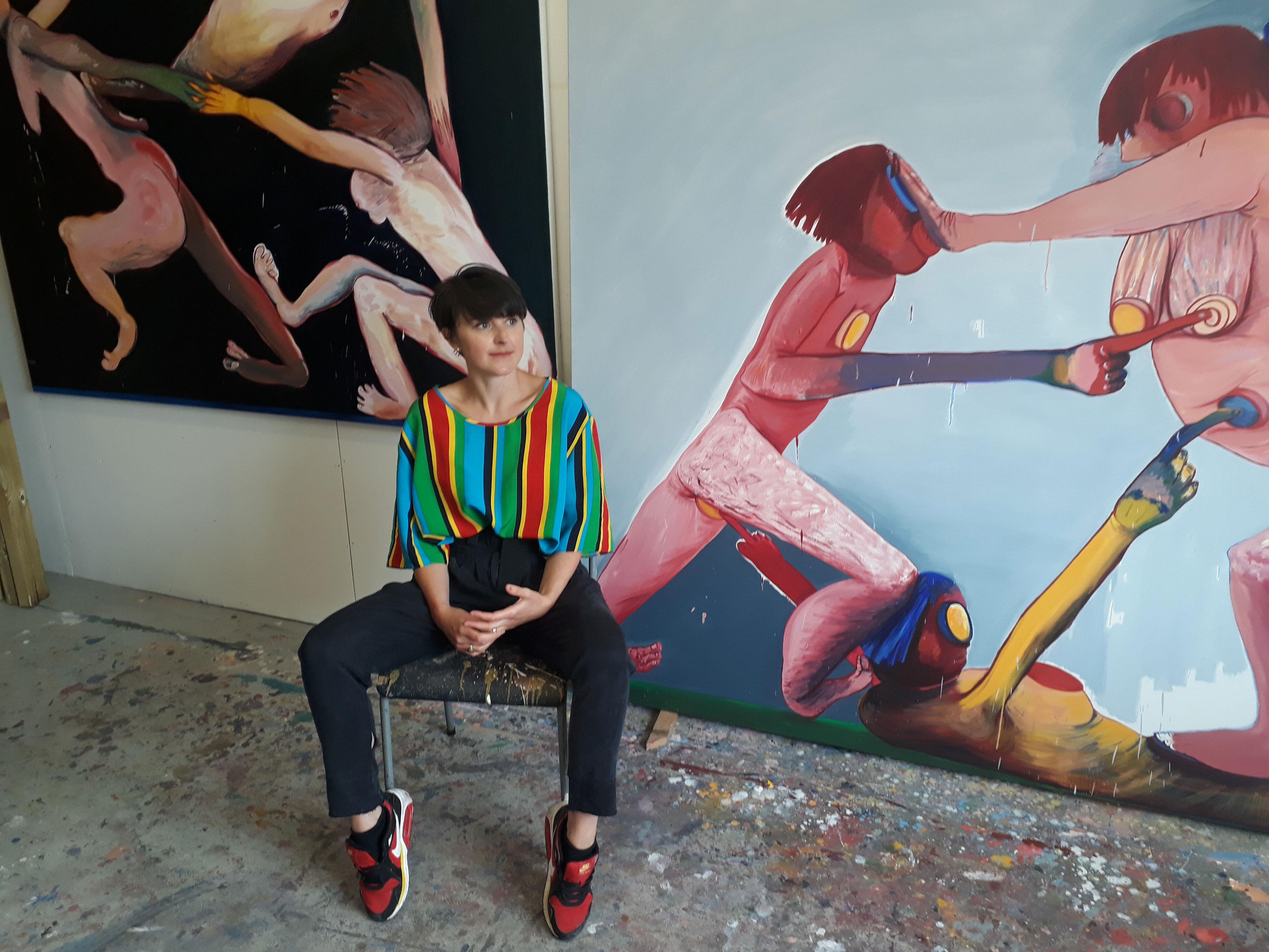 Emma Cousin was born in Yorkshire in 1986. She gained her BA from The Ruskin School of Art in 2004-2007. Cousin is a draw-er and a painter working in Peckham, London. Cousin’s figurative paintings feature dynamic, carnivalesque scenarios that explore the space between realism and fantasy, felt experience and communication. Interested in exploring the normative tensions within contemporary society, her contrapuntal compositions, colourful bodily extensions and awkwardly precise drawing acts out alternatives, led by a formal and diagrammatic logic. Responding to the limitations of language, Cousin considers how we might interact without it, in pre- or post-linguistic states. Painting ideas of support, mobility and progress, she often initially responds to words, in drawings that highlight puns and linguistic playfulness whilst breaking down meaning. Using metaphor as a visual vehicle she demonstrates the breach between the figurative meaning and the literal application.