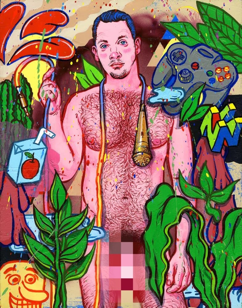 Erin Burrell was born in 1978 in Salt Lake City, Utah and lives and works in Los Angeles. He studied at Art Center College of Design in Pasadena, CA. Burrell has exhibited at Space15Twenty, LA, La Luz De Jesus Gallery, LA, Berlin Collective, Berlin. Most recent exhibitions include: Good Intentions, Subliminal Projects, Los Angeles (2013), Periphery Print Exchange, Artists Republic 4 Tomorrow, Laguna Beach, curated by Camilla Taylor (2013). Erin Burrell's work is influenced and affected by music, film, and the social community that surrounds him in Los Angeles, he focuses on the discovery of new ways to create portraits composed of mylar, acrylic, graphite and spray paint to form sub-layered drawings and sculptures. The painting’s story and title seem to be the perfect setup for conflicting human impulses toward civilization. Well-educated men regress to a primitive state in both sexual or violent behavior without leadership. How does this play out, and what happens to their moral or immortality, when they have been stripped of both power and duties in a natural environment?