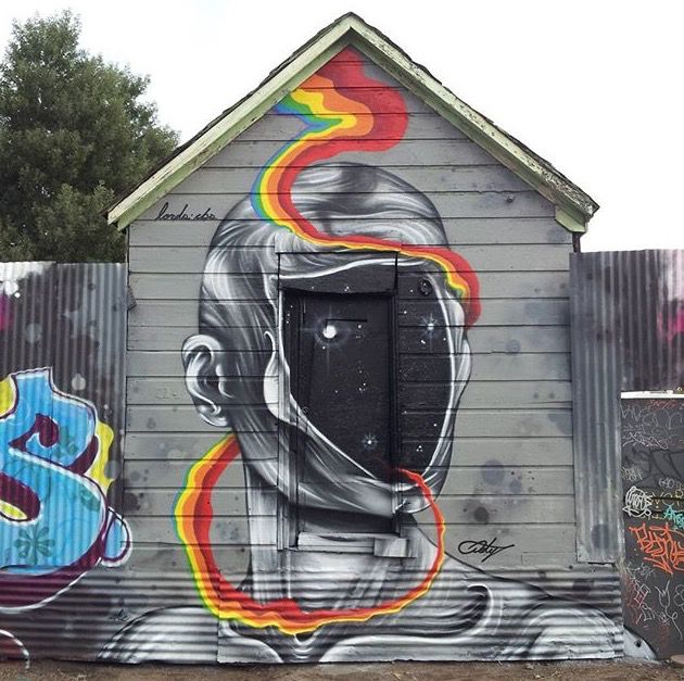 Ernest Doty grew up in New Mexico and is a member of the Oakland art community. While he is a member of several graffiti crews he is a muralist and not a writer. His murals enable him to tell a story and connect with the audience. He frequently paints stand alone birds or incorporates them into his murals like this one. In an interview he stated "they represent freedom and an ability to venture into the psychedelic realm. I definitely feel a connection to them as we are all one with nature whether we choose to accept and recognize it or not."