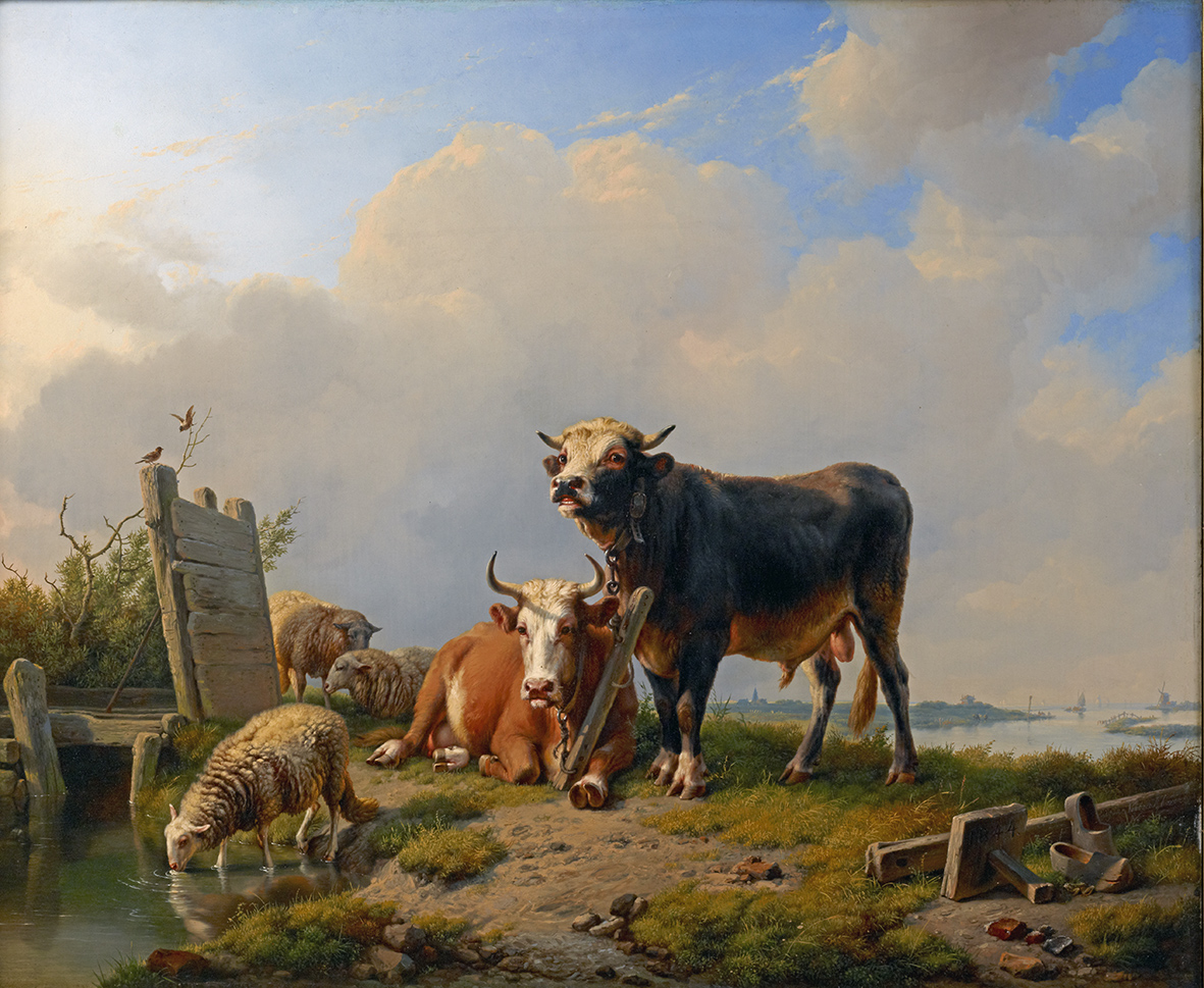 After 1818, Verboeckhoven pursued further painting studies with the landscape painter Balthazar-Paul Ommeganck. It was while he worked with Ommeganck that he came to understand the classical landscape tradition of Nicolas Poussin and Claude Lorraine that would ultimately become the foundation for his own painting. Ommeganck also introduced the fledgling artist to the work of seventeenth century Dutch and Flemish animaliers such as Paulus Potter and Albert Cuyp whose rural scenes featured domesticated animals in a bucolic landscape. For Verboeckhoven, the combination of anatomically precise cattle, sheep or goats and a pastoral landscape offered an ideal mixture of elements on which to base his career.