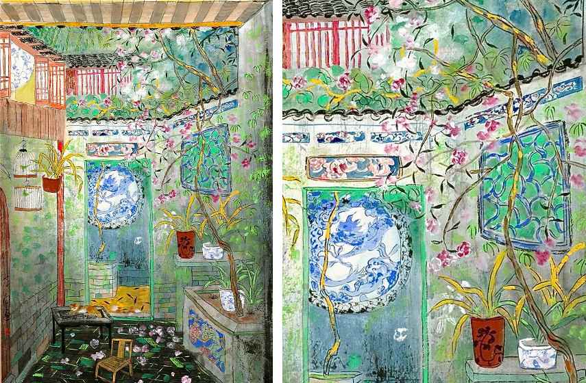 Fang Xiang manages to grasp both polarities at the same time, the calmness and activity. Simultaneously providing contradictional effects, Xiang succeeds in keeping the viewer engaged at all times. The paintings look like they live and breathe, almost as if it’s possible to hear the water and smell the flowers. He uses familiar elements such as bird cages, Chinese rooftops, lanterns, bamboo, and flowers. Fang Xiang won many awards for his art. In 2004, he won the bronze medal at the 10th National Chinese Fine Arts Competition. During the 90’s he won both silver and gold awards for his quiet, tranquil, yet lively and invigorating paintings of beautiful Chinese scenery.