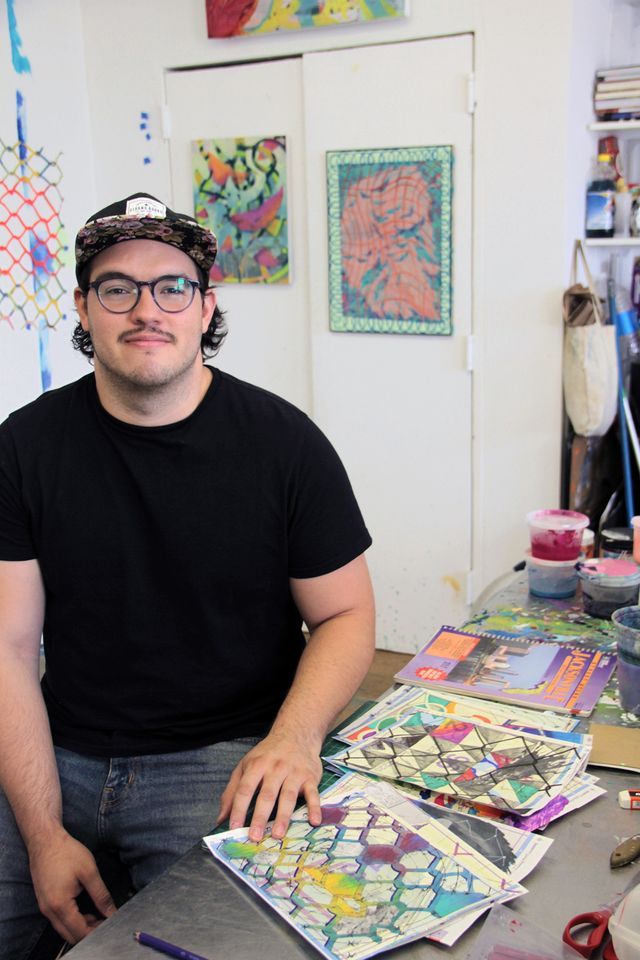 Francisco Donoso is a Latinx artist that creates mixed-media paintings, collages, and installations to explore the often unarticulated yet deeply felt complexities of the immigrant experience. The works become embodiments of human experience and sites where new worlds, or alter-mundos, are constructed -- and where notions of placement and fixed boundaries are questioned to reveal the precariousness of belonging. Through an intuitive process of working and layering paint, organic forms emerge that make reference to the impermanent: land, water, clouds and the celestial, becoming players in their own narratives of navigation, movement and placement. Hard edges, the chainlink fence and barbed wire make reference to maps, borders, fishing nets and the ubiquitous grid, which attempt to establish order to the amorphous. He's exhibited throughout New York, Las Vegas and Berlin and participated in numerous residencies including a Van Lier Fellowship at Wave Hill and the Artist in the Marketplace at The Bronx Museum of the Arts. He holds a BFA from Purchase College.