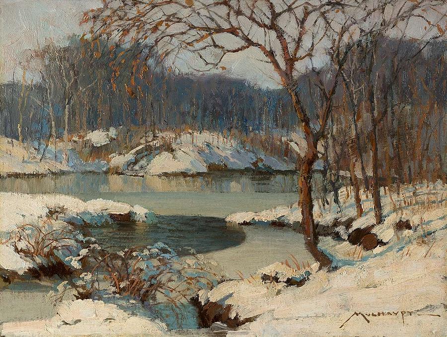 Born in Rock Port, Missouri, in 1871, Frederick Mulhaupt apprenticed with a sign painter before studying at the Kansas City School of Design and eventually enrolling at the Art Institute of Chicago in the early 1890s. By 1904, he had established a studio at the Salmagundi Club in New York City and soon after departed for Paris to further his artistic studies. There he was introduced to the techniques of Impressionism still flourishing among both his fellow expatriates and European counterparts, which would later emerge in his own work. During several years abroad, Mulhaupt exhibited at the Paris Salon and explored the St. Ives region of England, where he sketched fishermen hauling their nets with the day’s catch, a theme carried over in his paintings of the wharves and sailors of Gloucester, Massachusetts, for which he is today best known.