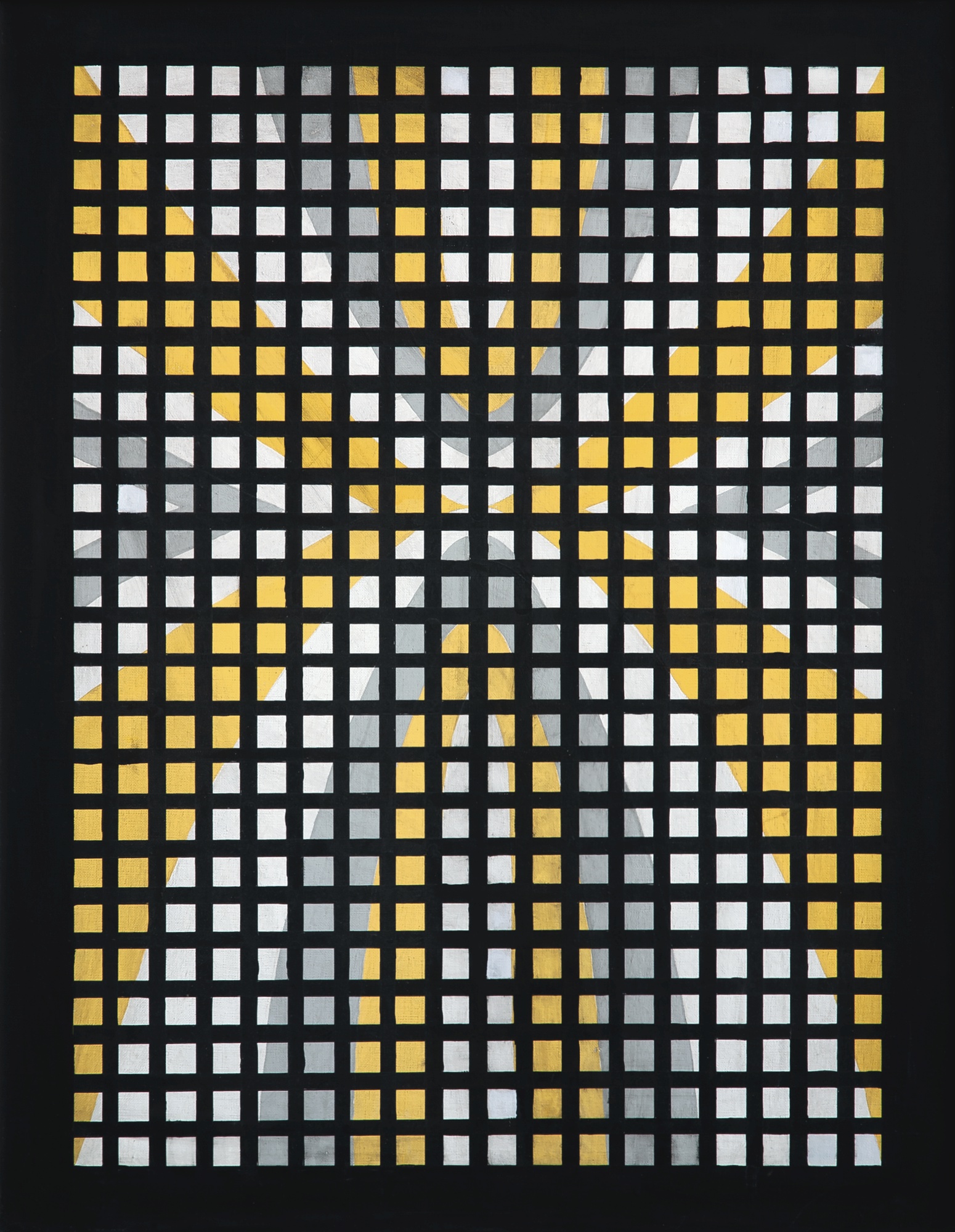 Bélgica Rodríguez refers about these works: “At the beginning, Genaro Moreno was influenced by the ortogonal system of the Stijil Group. His compositions consisted of a lattice formed by verticals and horizontals, forming squares in their intersection points. The color remained piecemeal enclosed in a frame that was, at the same time, the background on which the colored squares and rectangles rested. This approach differs from the Mondrian proposition, to whom the dynamic equilibrium – principle of pure painting – involves conceiving the square as an extensible fragment and, therefore, without real borders/edges, its projection being then subject to the variations determined by the extension or covered area, the intensity and color location in the plane. Genero Moreno has continued to develop this isometric plan, now with greater freedom, freedom that comes to assign a representative or symbolic value to color” (Bélgica Rodríguez. “La Pintura Abstracta en Venezuela, 1945-1965”. Galería de Arte Nacional. 1980).