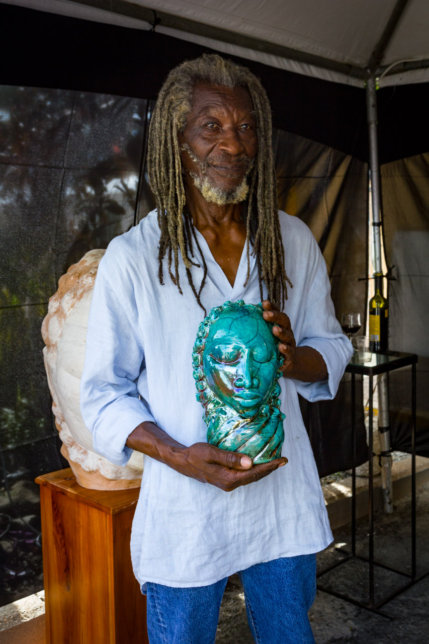 Born in 1946 in Wood Hall St Catherine; Pearson was only 15 years old when he was was first introduced to the medium of clay at the Jamaica School of Art now the Edna Manley College of the Visual and Performing Arts in 1960. He studied under Jamaica’s Master Potter Cecil Baugh with whom he developed a close relationship; Pearson recounted that “…[Baugh] was like a father to me and I was like the son he never have.” He was one of the first two students to graduate from the school with a Diploma in Ceramics in 1965 and subsequently went on to teach at his alma mater for almost eighteen years and also taught drawing and painting at Calabar and Vere Technical High Schools in the early 1970s. After he stopped teaching at the School of Art he began dividing his time between Jamaica and Northern California working with the Potters Studio in Berkley. He used the facilities there to produce his larger sculptures and his bronze works and also conducted workshops at University of Berkley and participated in exhibitions in California. He was also known to be a keen cultural entrepreneur having opened an eponymous gallery in New Kingston where he sold his ceramic and sculptural works. While he produced more conventional ceramics, such as vases and bowls, Pearson was best known for his sculptural work, especially his popular heads and masks which celebrated black beauty and dignity. Inspired by the arts of the ancient Nubia and Benin as well as Rastafari culture, the introverted monumentality of his sculptural works made them amongst the most distinctive and recognizable of the artists of his generation.