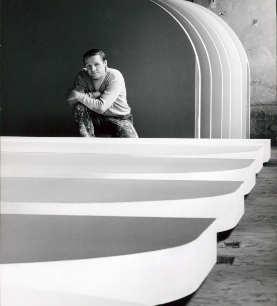 By the mid 1960s Pfahler had arrived on the international stage. Exhibitions such as “Signale” in Basel, Switzerland in 1965 contrasted color field artists from Europe and the United States. Pfahler showed his work alongside Al Held, Elsworth Kelly, Ken Noland, and Jules Olitski, and the critically acclaimed show cemented his status as a leading European artist of his generation. In 1966 Pfahler had his first show in the United States, where Barnett Newman curated his exhibition at Fischbach Gallery in New York. Then, at the Venice Biennale in 1970, Pfahler created one of the highlights of his career to much acclaim; a walkable structure that allowed visitors to physically experience the shape, color and spacial context that is central to his work.