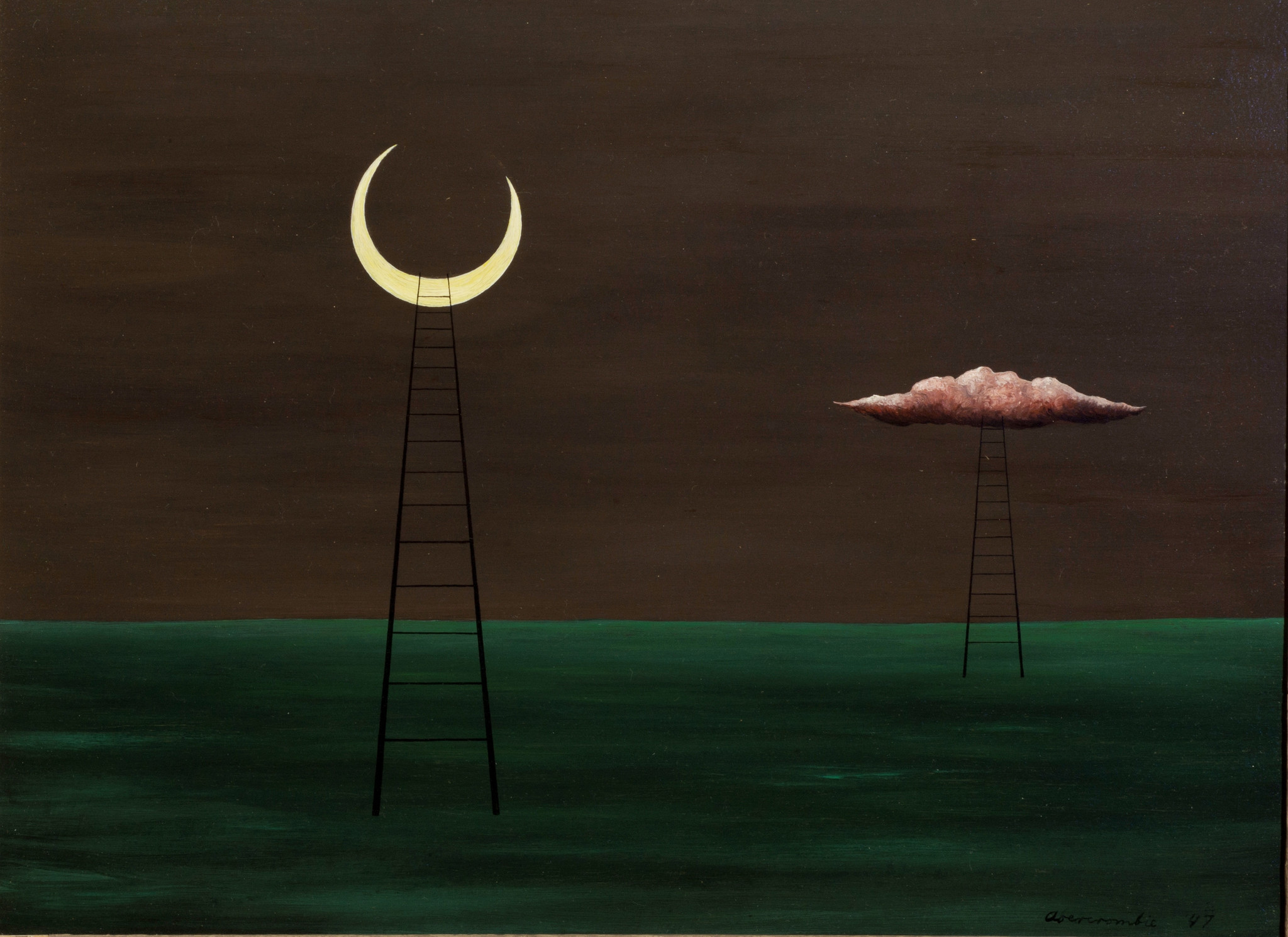 Although Abercrombie was not an “outsider artist,” she was proud of her relative lack of art training and her paintings display some of the attributes associated with unschooled artists. Because of this, she is often cited in discussions of this genre. A confirmed Midwesterner who lived the majority of her life in urban surroundings, she nonetheless often depicted rural settings; some paintings specifically titled as scenes from Aledo, the Illinois town where she spent part of her childhood. Abercrombie’s surreal scenes were drawn from her own mental landscape, no doubt expedited by her entering psychoanalysis in the 1950s with Dr. Franz Alexander, who founded the Institute for Psychoanalysis and was an important figure to such younger artists of the era as Leon Golub.