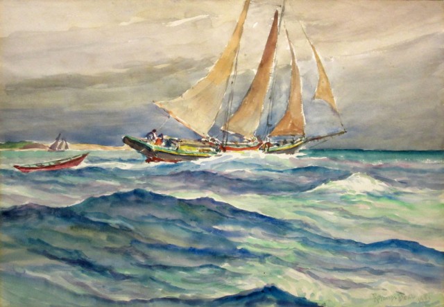 Born in San Francisco, California on July 7, 1875, Gordon Hope Grant is known for his etchings and paintings of marine subjects. At age 13, he was sent to Scotland for schooling, and the four-month sail around Cape Horn remained a permanent influence on his career. He studied art in Heatherly and Lambeth Art Schools in London, and then in 1895, became a staff artist for the San Francisco "Examiner." The next year, he took the same type of job for the "New York World". He also worked for "Puck" magazine for 8 years and did illustration for children's and adult books. For "Harper's Weekly", he served as a combat artist for both the Boer War and the Mexican Revolution.