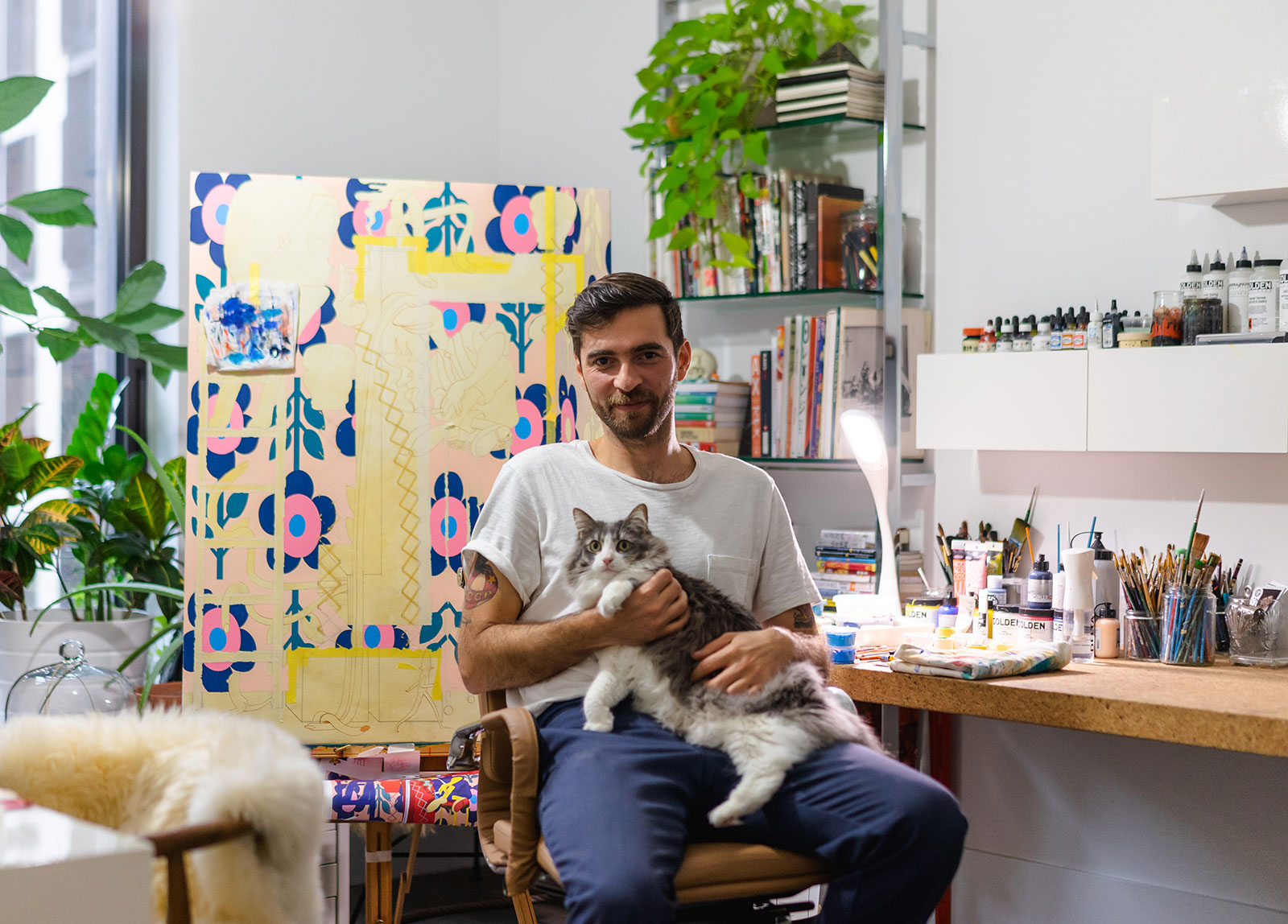 Gosha Levochkin, known to many simply as “Gosha,” is as unique as the worlds that he creates in his paintings. Working in the tradition of “ligne clair,” Gosha paints characters with a depth and emotional weight that emanates from their eyes. Although his paintings appear flat at first glance, stripping them of extraneous elements like shadow and hatching allow Gosha to focus on the stories that resonate with the inner child in all who come into contact with the work.