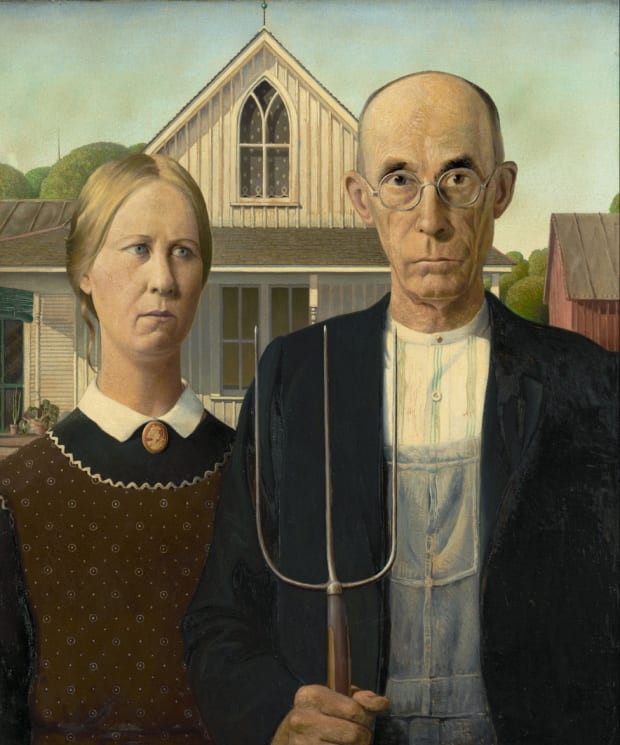 Wood first traveled to Europe in 1920, visiting Paris with fellow artist Marvin Cone. He returned to Paris in 1923 to attend the Académie Julian, and again in 1926, when he had his first gallery show. While abroad Wood familiarized himself with impressionism and post-impressionism, but he rejected more radical modernist styles such as cubism in his own paintings. Wood’s work was popular in the business community of Cedar Rapids, where his commissions ranged widely and his style varied to suit the client: murals for restaurants in a hotel chain, portraits for a dairy equipment factory, and store and home design. He converted a hayloft behind the funeral home of his patron and sometimes agent, David Turner, to a home and studio that he shared with his mother and sister. In 1928 Wood went to Munich, Germany, to supervise the manufacture of a stained-glass window that had been commissioned by the Daughters of the American Revolution for the Veterans Memorial Building in Cedar Rapids. There he was attracted to the modern Neue Sachlichkeit (new objectivity) movement. Inspired by northern masters such as Jan van Eyck (Netherlandish, c. 1390 - 1441) and Hans Memling (Netherlandish, active c. 1465 - 1494), this movement revived a realist style of painting with stylized forms. Wood’s time in Germany, coupled with his involvement in the burgeoning regionalism of the Cedar Rapids artistic community, led to a decisive change in his style.