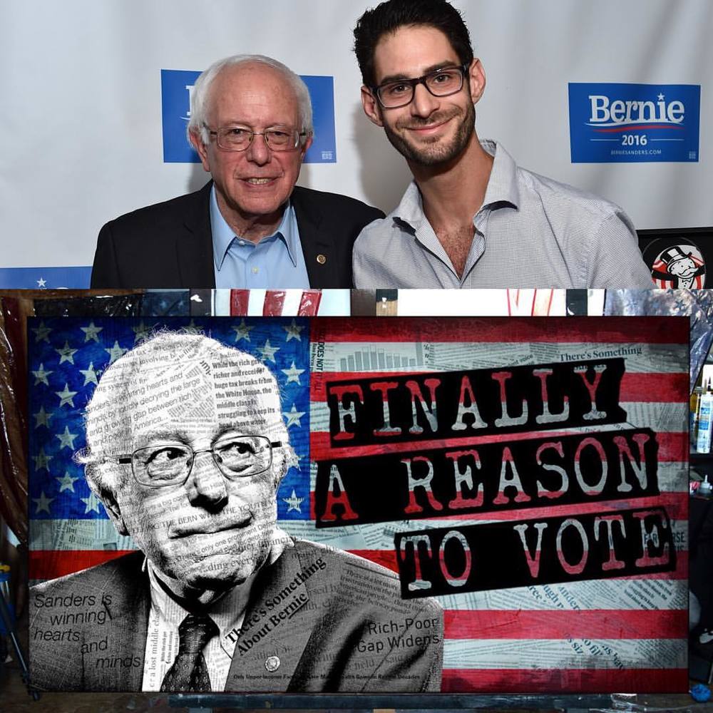 Greg Auerbach made his first piece of art while living in a studio in Downtown Los Angeles. Unable to afford to decorate his walls, he decided to try his hand at stencils and relative-collage, making a 6-foot piece of Alfred Hitchcock spray painted over vintage murder and mystery headlines from the 1800's -1960's. His concept was simple at first; to pay homage and respect to the people he admired, by painting them among a bed of their themes, inspirations, lives and societal impacts. This quickly blossomed into a career in mixed-media, with materials like spray paint, acrylics, bullet shells, ink, stencils, needles, silk screens, bricks, concrete and various created methods of experimentation and play with found objects. His style is bold and often confrontational with a twist of hope and irony always present – as in “In A Brighter World” - resin over “acquired” LAPD bullet shells, with an image of a gun expelling not violence but instead a swarm of butterflies. Greg’s biggest passion is political work. The series “Future: No Future,” depicts scenes of ongoing world travesties and their repercussions (i.e. homelessness, energy crisis, global warming). The series is ongoing. Greg's work has been featured from Los Angeles to India, and has become part of collections both private and corporate, featured in The Washington Post, Vanity Fair, Architectural Digest, Variety and other publications, and featured on TV, most recently, on the hit show “Empire” on Fox. Greg also toured with the Bernie Sanders campaign after two pieces he made became favorites of media and supporters of the campaign. At 33-years-old, he continues to propel forward, making beautiful, sometimes haunting works, with bold statements and heartfelt care. He received his BFA from the School of Visual Arts, in New York.