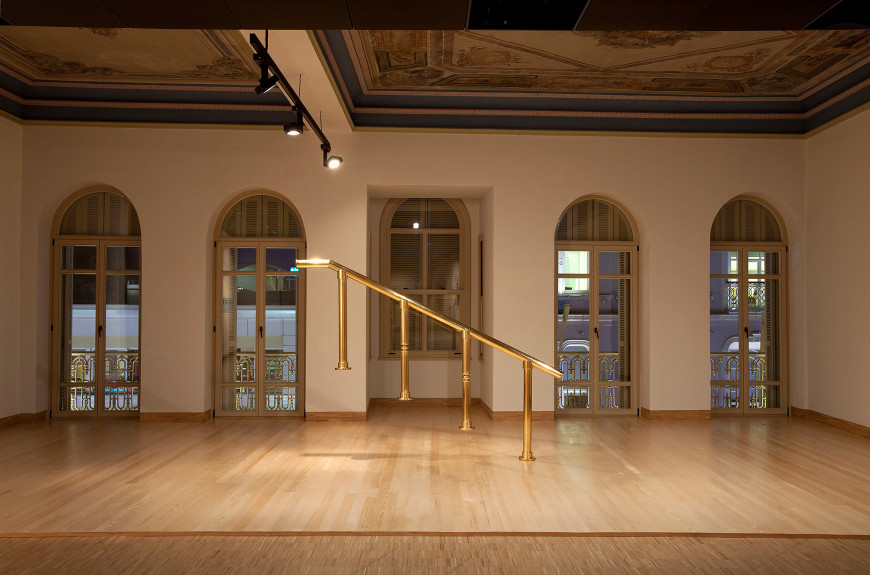 Khan’s Bank Bannister (Banque Bannister, 2010) is one of a number of sculptures—others include Brass Column (2007), 44 unique and repetitious markers of value (2010), The Knot (2012), and The Twist (2012)—that reveal his interest in confluences of architectural and artistic form. Using displaced details to transform our experience of gallery space—exploiting the associations of the works’ gold-colored metallic constitution with power and wealth—Khan further complicates the project by representing specific, identifiable fixtures. Bank Bannister replicates a bannister outside the main branch of Banque Misr on Mohamed Farid Street in downtown Cairo. According to Khan, the railing’s ornate design renders it almost useless for its ostensible purpose, but significant nonetheless as part of the institution’s public image. The sculpture is also presented as an idealized object charged with a mysterious, almost ahistorical resonance.
