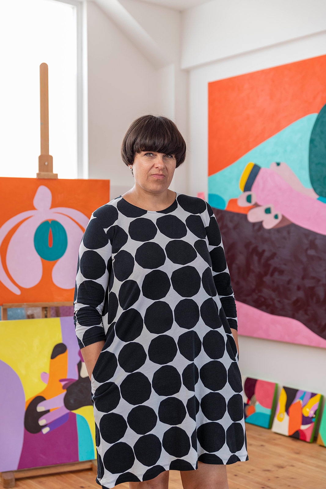 Born in Birmingham 1971, Helen studied at Bournemouth and Poole college of Art and Design, graduating in 1992. After graduating Helen worked as a freelance wardrobe stylist and assistant art director in the film industry for 15 years. Whilst continuing her art practise, working in various mediums including paint, collage and needlepoint. As well as making sculptures and installations. She now lives and works in Brighton. The work explores themes set within a broader context of relationships and sex. Recent large colour field oil paintings of closely cropped sexual images, are drawn from pornographic material, but subverted into colourful joyous works. They take back ownership of sexual imagery from the predominately male gaze of the photographic or video image, and portray sex in a technicolour palette of stylized shapes, textured with a myraid of fluid brushstrokes that stroke the skin of those depicted, like fingers on skin. Her needlepoint works use the same subject matter but as this is often seen as a female pursuit it adds further poignancy.