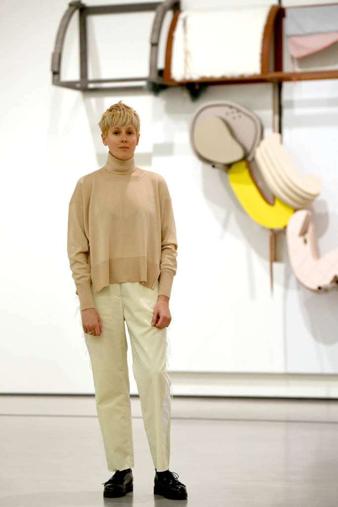 For the Turner Prize, 2016 exhibition, held at Tate Britain, Marten included three works from the exhibitions for which she was nominated: her presentation at the 56th Venice Biennale and Eucalyptus, Let us in at Naftali, New York. Focusing on rhythms of rest and work, the sculptures were reconceived at Tate Britain as a single installation. They consisted of: Lunar Nibs (a sculpture resembling a house, a dumpster and even a feeding trough for cattle, whose main facade looked like a caricatured nineteenth-century residence), On aerial greens (haymakers), (a wall- and floor-based pairing formally resembling a fireplace or hearth) and Brood and Bitter Pass (a large-scale work composed of spun aluminium forms, wooden ellipsoids, ceramic parts and mechanical joints in a worm-like form).