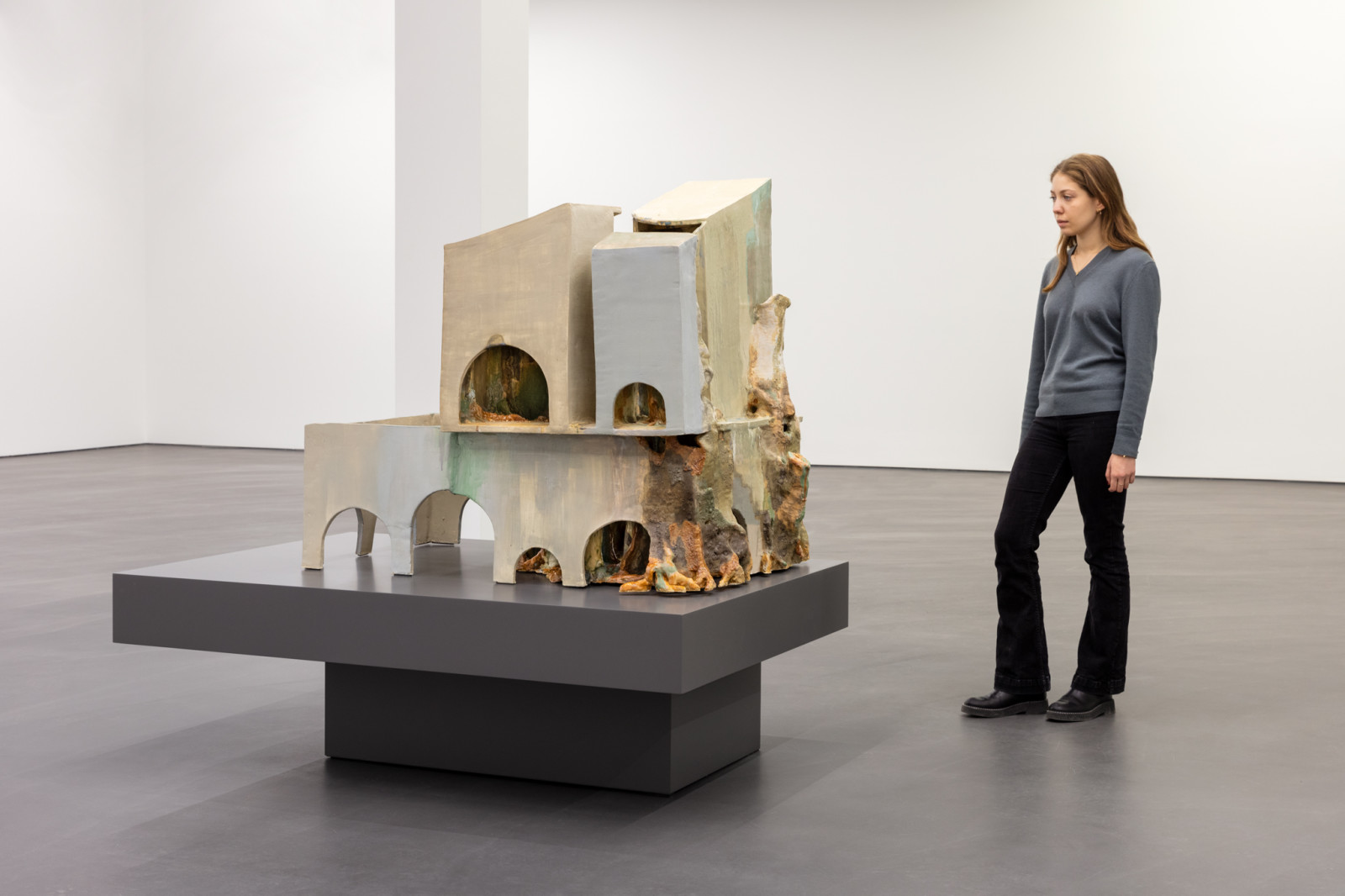Known for her engagement with the history of architectural styles—especially the legacy of Modernism and 1950s–70s examples of concrete architecture—Isa Melsheimer’s works are expressions of her intense research as well as formal investigations. The artist acts as archeologist of often forgotten or neglected buildings, recreating their distinctive shapes both from her study and from her vivid re-imagining of the forms and the spirit of the structures. The shift of scale inherent in the artist’s allusion to architectural structures often lets the works, made from poured concrete, appear as benches, stool-like objects, tiered steps or hollow containers that sometimes double as sites of constructed exotic vegetation. A recent body of work, her glazed ceramics find another kind of representation of architectural structures that depart in scale, material and color from the sources. Although their scale recalls the miniaturized and schematic appearance of preliminary architectural models, the material and colors add a fantastic, playful aspect. All her objects take a certain amount of free license, sometimes containing elements of fantastic recreation, but are always infused with a deep understanding and sympathy for their architectural sources.