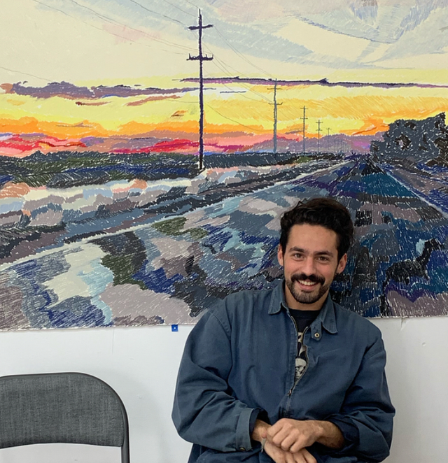 Ivan Rios-Fetchko is a painter and writer currently living and working in Los Angeles, California, where he was raised. In 2018, he graduated from the Brown/RISD Dual-Degree program with a BFA in Painting from RISD and a BA in Comparative Literature from Brown. His capstone presentation wove together paintings about River Phoenix in "My Own Private Idaho" and Faulkner's writings about history, memory, and how they appear in the physical landscape to think about the American landscape in new ways. --- My recent work continues my struggle with American identity and how it appears in the self and the land. Having considered myself a 'landscape painter' for many years, I found myself struggling to reconcile a painterly desire for nature's open spaces with the reality of living in the urban setting of Los Angeles. While the natural landscape quietly builds up history within it, the city accumulates history in the remnants of buildings that have been torn down and rebuilt or remodeled over and over. Thinking of this accumulation, I am drawn to strip malls and murals, where change happens quickly and frequently. My interest in sunsets comes from the painterly history of them, as well as the way that they beautifully--and sadly--convey endings. Growing up as a cultural and genealogical 'mutt' in Los Angeles, I truly felt that I was at the "end of the road." The westward push that brought the United States (and untold violence with it) to the Pacific Ocean had to end somewhere: the last stop of Route 66 was where I got off to go to high school. It occurred to me that every step West was greeted with a sun setting, a day ending, a fantasy fizzling out. My paintings and, recently, oil pastel drawings have tried to deal with the contradictions that exist at the 'ends of things,' even as time and life refuse to 'end.'