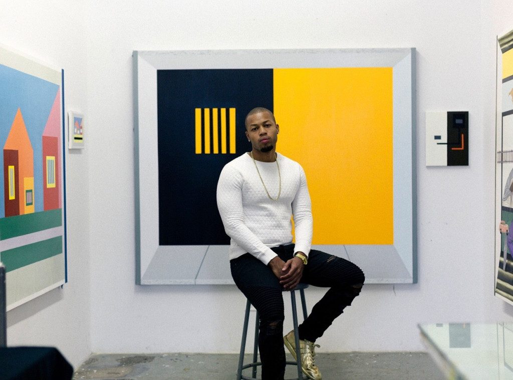“As young African Americans looking for inspiration and knowledge, we find ourselves looking at idols and tokens that are on display not realizing we are the ones being displayed. It’s hard to value cultural history as young black men when you are living in the most oppressed places and impoverished communities. Within these framed structures, I intend to evoke a sense of lateral movement through space and economic development with temporal moments of being on display that are restricted to move vertically or up the economic ladder. The backgrounds are a reference to a time in history when abstract expressionist color painters like Barnett Newman and Mark Rothko shot through the western canon. By using these modern master techniques, I want to understand the relationship between the moment these artists created new hierarchical social structures and what was happening with the African American diaspora during this pivotal time in history. Through this juxtaposition, I used symbols and monograms that fade in and out of the painting as a remembrance to our social disposition and its relationship to our current political climate. “ Jamaal Peterman