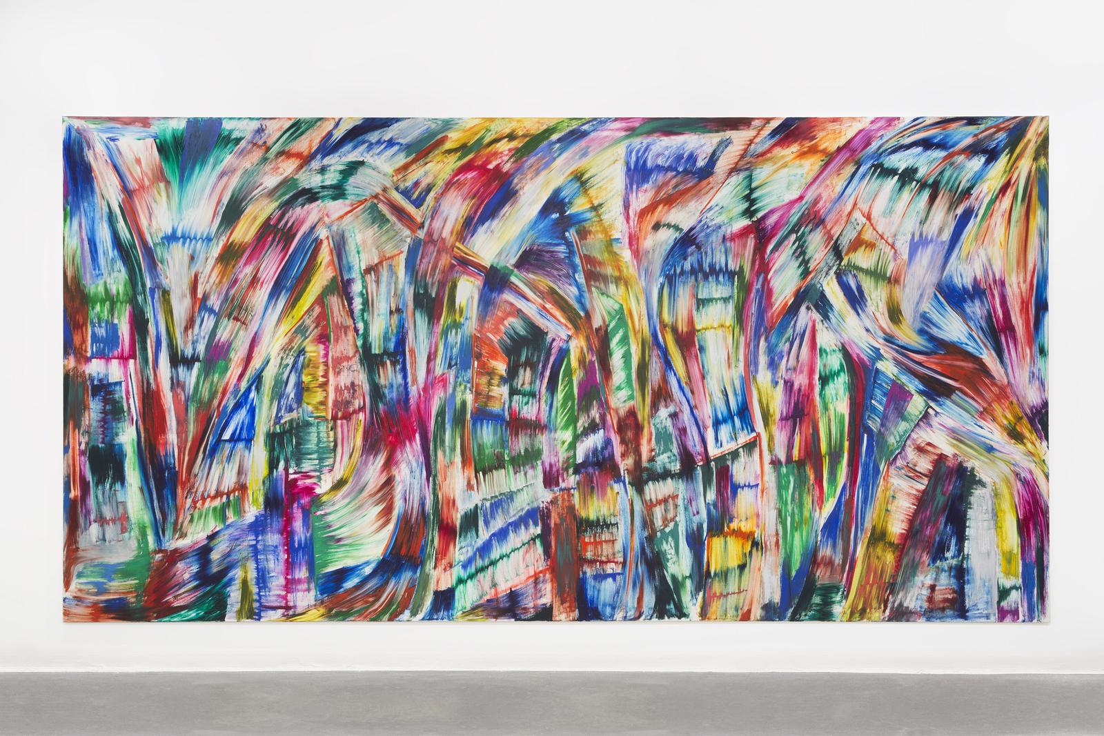 Jan Pleitner creates striking and expressive abstract painting driven by subconscious thought. Often painted in short bursts of time, or even marathon single sittings, the works are full of movement and energy, with jolting lines pulling the eye up and down the canvas. Pleitner’s highly physical approach to painting sees him scrape through layers of paint as readily as he builds them up, resulting in a highly tactile canvas. His deep colour palette is lively and mercurial, with elemental patches, streaks and lines bleeding into one another and jostling for space aggressively, but not inharmoniously. Imbued with symbolic properties, they point towards a synesthesiac sensibility. Jan Pleitner lives and works in Germany.